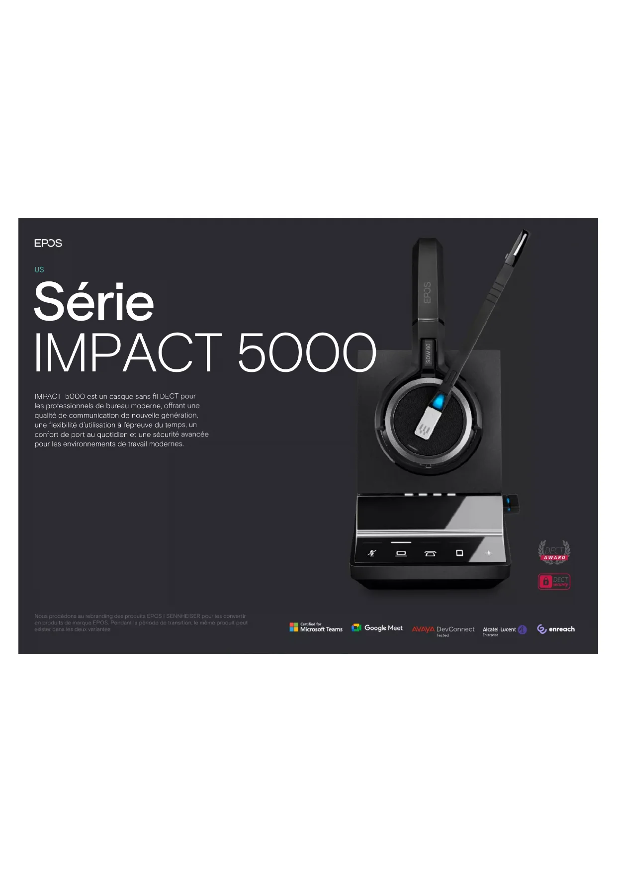 Nous procédons au rebranding des produits EPOS | SENNHEISER pour les convertir en produits de marque EPOS. Pendant la période de transition, le même produit peut exister dans les deux variantes Série IMPACT 5000Fact Sheet Améliorez la sécurité de tous vos appels Grâce à l’appairage protégé, l’authentication 128 bits, la certication DECT Security et le logiciel EPOS Manager. Protez d’un son de qualité supérieure signé EPOS Son très large bande et système antibruit de pointe à deux micros conformes aux spécications Teams Open Oce. Augmentez la productivité et la concentration Grâce à un voyant dʼappel en cours visible, des coussinets dʼoreille qui réduisent le bruit et une gestion simpliée des appels. Orez à vos employés une exibilité totale Ce micro-casque exible sʼappaire facilement à tous les appareils et ore une portée sans l importante de 180 m. Bénéciez d’un confort de port optimal tout au long de la journée Grâce à des coussinets dʼoreille souples en similicuir et à un large choix de styles de port, pour un confort optimal, un bien-être durable et une ecacité renforcée. Plus d’infos sur eposaudio.com/IMPACT-5000 Série IMPACT 5000 - US Caractéristiques principalesSérie IMPACT 5000 - US Fact Sheet Dongle USB Câble USB Guide de sûreté Guick guide Casque Unité d’alimentation électrique Câble de téléphone audio Exemples d’éléments contenus dans la boîte (peut varier selon le modèle de produit) : Fiche de conformité Station de base Contenu de la boîteSérie IMPACT 5000 - US Fact Sheet Prendre/Terminer un appel Activation/désactivation du mode muet Mode d’emploi IMPACT 5000 Charger les contacts Speaker Compartiment de la batterie Plaque de nom Bouton crochet/Teams Sourdine et bouton de volume LED du casque Bouton de mise en sourdine Microphone 1sSérie IMPACT 5000 - US Fact Sheet Mode large bande haute densité Fournit un son net et naturel pour des appels clairs, même dans les environnements de bureau denses. Triple connectivité Restez connecté simultanément à votre ordinateur, votre téléphone de bureau et votre téléphone mobile. Autonomie en conversation étendue Vous pouvez parler sans interruption pendant 14 heures en bande étroite. Recharge rapide Soyez opérationnel(le) en toutes circonstances rechargez la batterie à 50 en à peine 30 minutes. Technologie EPOS ActiveGard