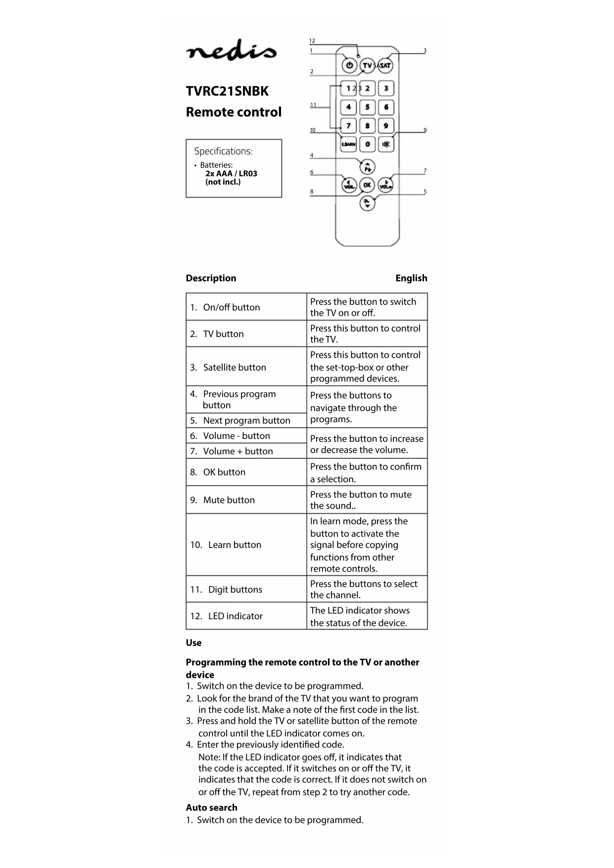 TVRC21SNBK - Télécommande NEDIS - Notice d'utilisation et mode d'emploi gratuit