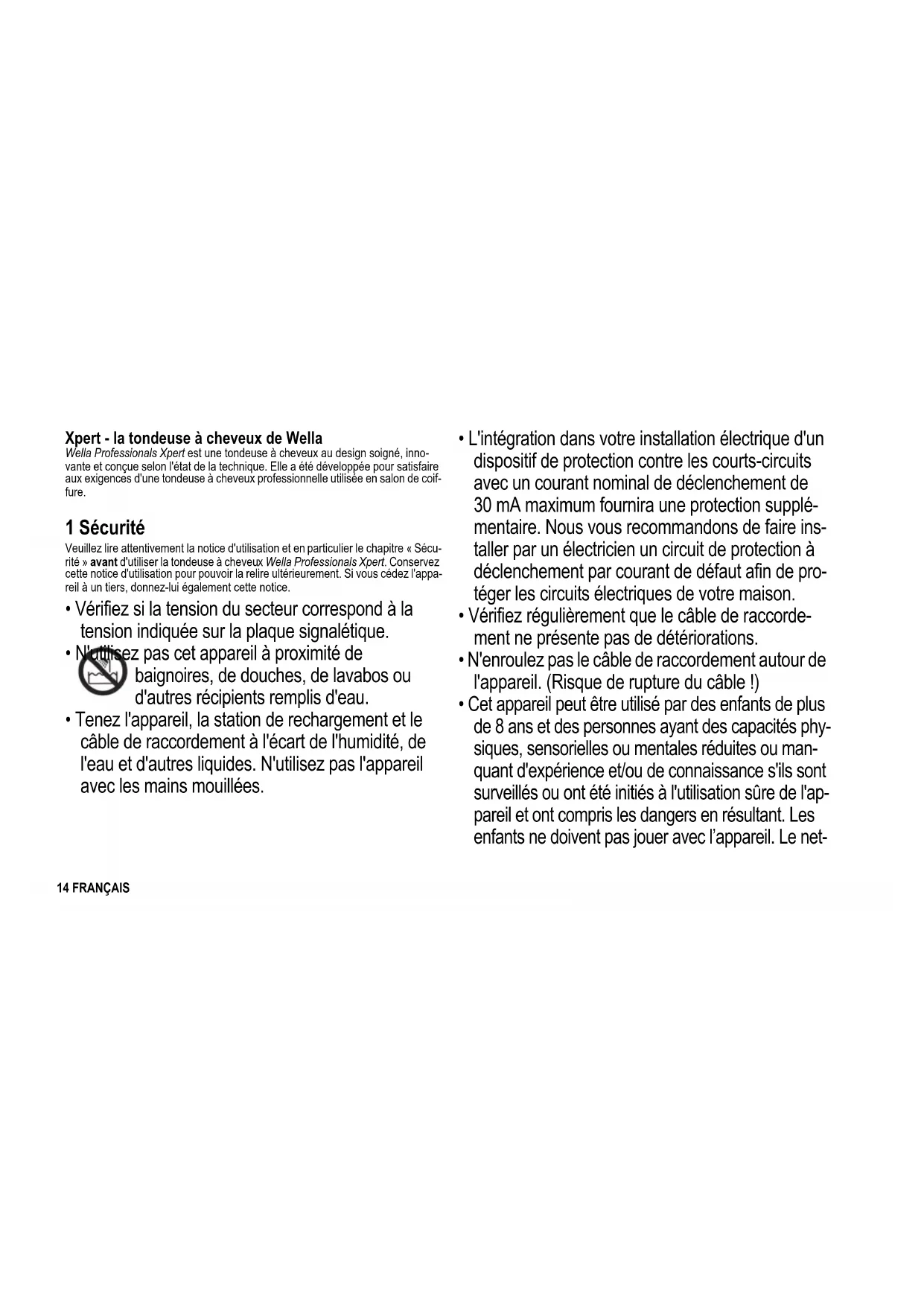 - Cet appareil peut être utilisé par des enfants de plus de 8 ans et des personnes ayant des capacités phy- siques, sensorielles ou mentales réduites ou man- quant d'expérience et/ou de connaissance s'ils sont surveillés ou ont été initiés à l'utilisation sûre de l'ap- pareil et ont compris les dangers en résultant. Les enfants ne doivent pas jouer avec l’appareil. Le net- U24_Wella_Xpert.book Seite 14 Mittwoch, 29. Oktober 2014 4:07 0415FRANÇAIS toyage et l'entretien à réaliser par l’utilisateur ne doivent pas être effectués par des enfants sans sur- veillance.