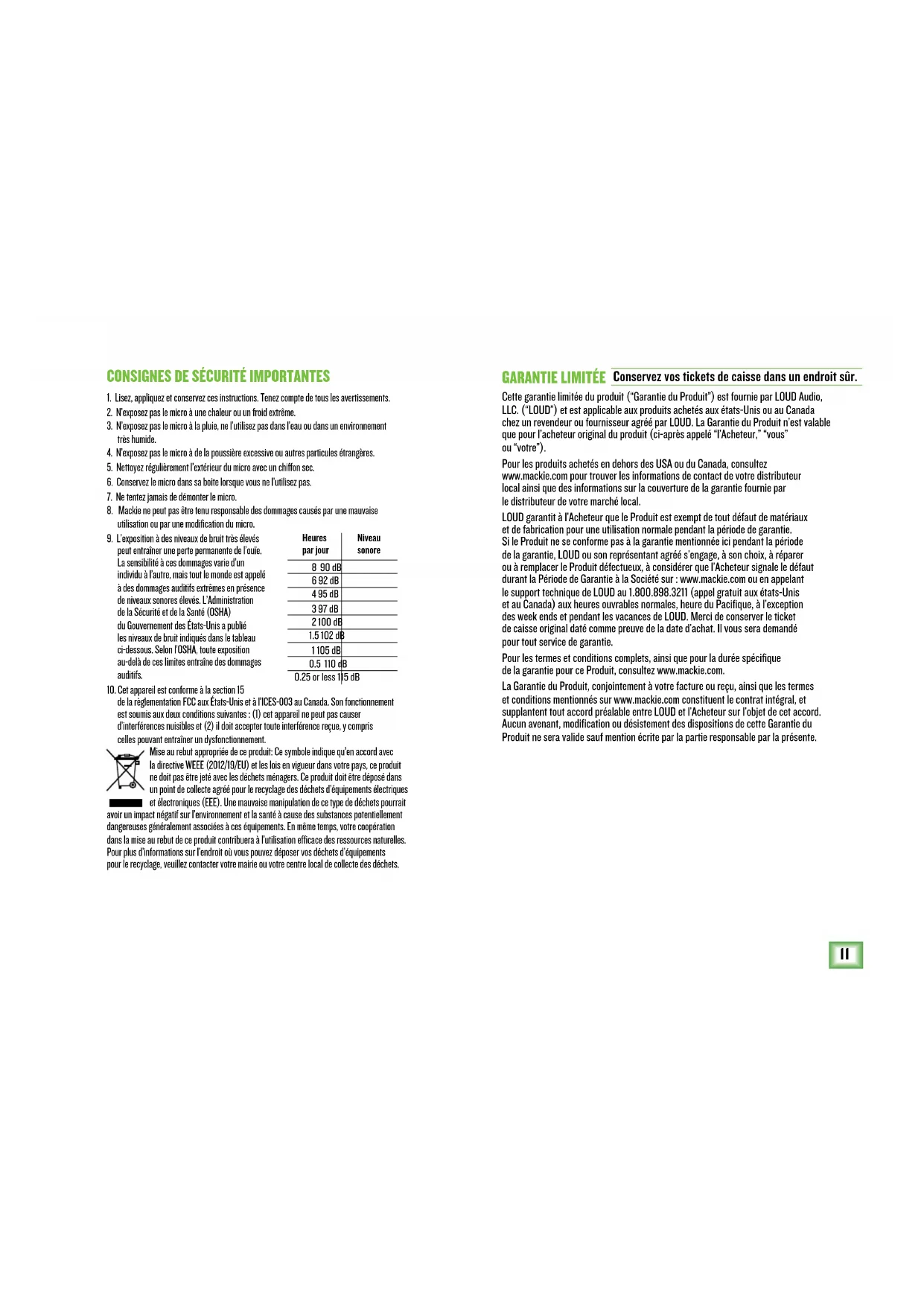 LOUD garantit à l'Acheteur que le Produit est exempt de tout défaut de matériaux et de fabrication pour une utilisation normale pendant la période de garantie. Si le Produit ne se conforme pas à la garantie mentionnée ici pendant la période de la garantie, LOUD ou son représentant s'engage, à son choix, à réparer ou à remplacer le Produit défectueux, à condition que l'Acheteur signale le défaut durant la Période de Garantie à la Société sur: www. mackie. com ou en appelant le support technique de LOUD au 1.800.898.3211 (appel gratuit aux États-Unis et au Canada) aux heures ouvrables normales, heures du Pacifique, à l'exception des week-ends et pendant les vacances de LOUD. Merci de conserver le ticket de caisse original daté comme preuve de la date d'achat. Il vous sera demandé pour tout service de garantie.