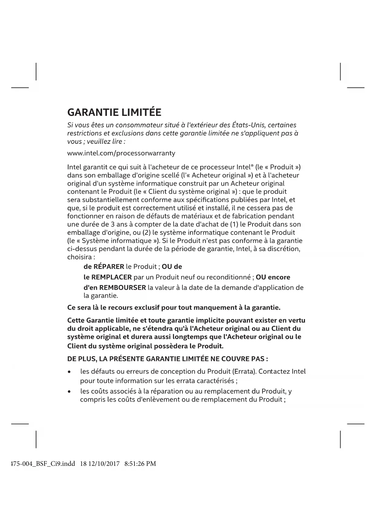 Vouspouvezvousadresserausited'achatouàIntelenappelantuncentre d'AssistanceàlaclientèleIntel(ICS)pendantlesheuresouvrables.Vous serezinvité(e)àfournir(1)voscoordonnées;(2)unepreuved'achat;(3)le nomdumodèleetlenumérod'identicationduProduit;(4)uneexplication duproblèmeet(5)d'autresrenseignementssinécessaire.Sil'ICSconrme queleProduitestéligiblepourleservicedegarantie,vousrecevrezun numérod'autorisationderetourmatériel(RMA)etdesinstructionspourle retourduProduit. IntelvousenverraàsesfraisleProduitréparéouleProduitde remplacementdansundélairaisonnableaprèsréceptionduProduit retourné.Leproduitderemplacementseragarantiselonlestermesdela présenteGarantielimitée,ycomprissesexclusions,saufqueladuréedela garantieseracelledelapluslonguedesdeuxpériodessuivantes: J61475-004_BSF_Ci9.indd 19 12/10/2017 8:51:26 PM(1)90jours,àcompterdeladated'expéditionàvotreintentionduProduit réparéouduProduit,ou(2)lerestedelapériodedegarantieduProduit retournéplusunepériodesupplémentaireégaleaunombredejoursentrele momentoùvousavisezl'ICSdubesoindeservicedegarantieetlemoment oùvousrecevezleProduitréparéouleProduitderemplacement.