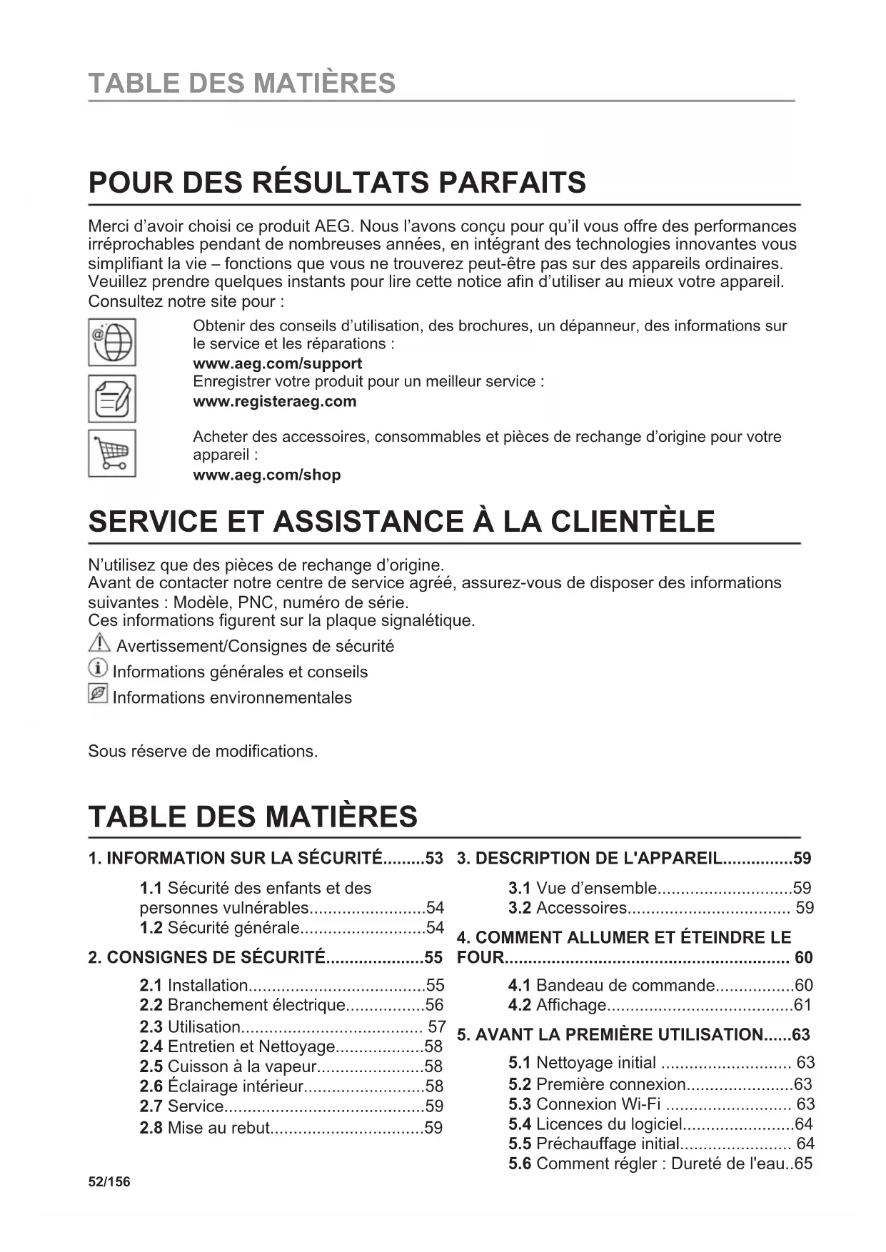 N’utilisez que des pièces de rechange d’origine. Avant de contacter notre centre de service agréé, assurez-vous de disposer des informations suivantes : Modèle, PNC, numéro de série. Ces informations figurent sur la plaque signalétique. Avertissement/Consignes de sécurité Informations générales et conseils Informations environnementales Sous réserve de modifications.