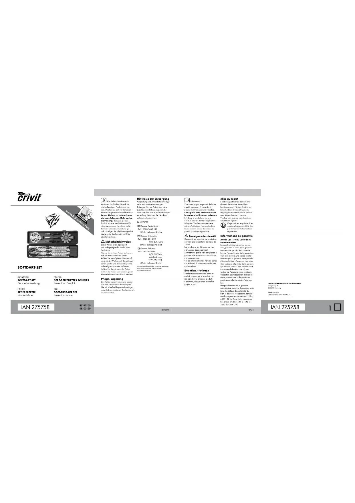 Instructions for use Herzlichen Glückwunsch! Mit Ihrem Kauf haben Sie sich für ein hochwertiges Produkt entschie- den. Machen Sie sich vor der ersten Verwendung mit dem Produkt vertraut. Lesen Sie hierzu aufmerksam die nachfolgende Gebrauchs- anweisung. Benutzen Sie das Produkt nur wie beschrieben und für die angegebenen Einsatzbereiche. Bewahren Sie diese Anleitung gut auf. Händigen Sie alle Unterlagen bei Weitergabe des Produkts an Dritte ebenfalls mit aus. Sicherheitshinweise Dieser Artikel ist ein Sportgerät undnicht geeignet für Kinder unter 14Jahren. Werfen Sie mit den Pfeilen auf keinen Fall auf Menschen oder Tiere! Achten Sie beim Spielen bitte darauf, dass sich im Wurfbereich (Bereich zwi- schen Spieler und Zielscheibe) keine unbeteiligten Personen aufhalten. Achten Sie darauf, dass der Artikel nicht in die Hände von Kindern gerät! Kleinteile können verschluckt werden! Pflege, Lagerung Den Artikel immer trocken und sauber in einem temperierten Raum lagern. Nie mit scharfen Pflegemitteln reinigen, nur mit einem trockenen Reinigungstuch sauber wischen. DE/AT/CH Hinweise zur Entsorgung Verpackung und Artikel bitte umweltge- recht und sortenrein entsorgen! Entsorgen Sie den Artikel über einen zugelassenen Entsorgungsbetrieb oder über Ihre kommunale Gemeinde- verwaltung. Beachten Sie die aktuell geltenden Vorschriften. IAN: 275758 Service Deutschland Tel.: 0800 5435 111 E-Mail: deltasport@lidl.de Service Österreich Tel.: 0820 201 222 (0,15EUR/Min.) E-Mail: deltasport@lidl.at Service Schweiz Tel.: 0842 665566 (0,08 CHF/Min., Mobilfunk max. 0,40CHF/Min.) E-Mail: deltasport@lidl.ch Ersatzteile zu Ihrem Artikel finden Sie auch unter: www.delta-sport.com, Rubrik Service - Ersatzteilservice Lidl Félicitations ! Vous avez acquis un produit de haute qualité. Apprenez à connaître le produit avant sa première utilisation. Lisez pour cela attentivement la notice d’utilisation suivante. N’utilisez le produit que comme décrit et pour les zones d’application indiquées. Veuillez conserver cette notice d’utilisation. Transmettez tous les documents en cas de cession du produit à une tierce personne. Consignes de sécurité Ce produit est un article de sport et ne convient pas aux enfants de moins de 14 ans. Ne pas lancer les fléchettes sur des animaux ou des personnes ! Assurez-vous que la cible soit placée si possible à un endroit inaccessible aux autres personnes. Veillez à tenir cet article hors de portée des enfants ! Ils pourraient avaler des petites pièces ! Entretien, stockage Stocker toujours cet article dans un endroit propre, sec et tempéré. Ne jamais nettoyer avec des produits d‘entretien, essuyer avec un chiffon propre et sec. Mise au rebut L’emballage et l’article doivent être éliminés de manière favorable à l’environnement. Eliminez l’article par l’intermédiaire d’une entreprise de recyclage autorisée ou via les services compétents de votre commune. Veuillez tenir compte des directives actuelles en vigueur. Ce produit est recyclable. Il est soumis à la responsabilité élar- gie du fabricant et est collecté séparément. Informations de garantie Article L211-16 du Code de la consommation Lorsque l‘acheteur demande au ven- deur, pendant le cours de la garantie commerciale qui lui a été consentie lors de l‘acquisition ou de la réparation d‘un bien meuble, une remise en état couverte par la garantie, toute période d‘immobilisation d‘au moins sept jours vient s‘ajouter à la durée de la garantie qui restait à courir. Cette période court à compter de la demande d‘inter- vention de l‘acheteur ou de la mise à disposition pour réparation du bien en cause, si cette mise à disposition est postérieure à la demande d‘interven- tion. Indépendamment de la garantie commerciale souscrite, le vendeur reste tenu des défauts de conformité du bien et des vices rédhibitoires dans les conditions prévues aux articles L211-4 à L211-13 du Code de la consomma- tion et aux articles 1641 à 1648 et 2232 du Code Civil. FR/CH