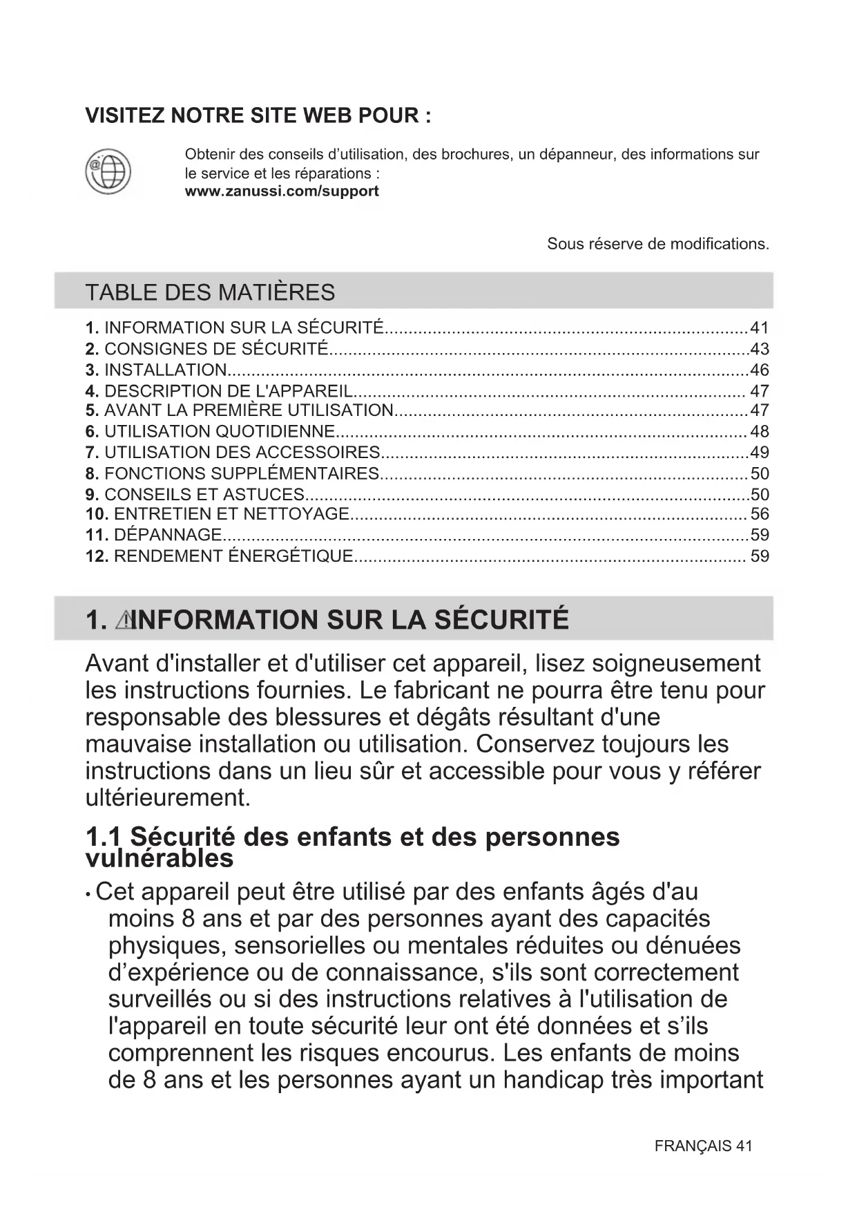 Recyclez les matériaux portant le symbole . Déposez les emballages dans les conteneurs prévus à cet effet. Contribuez à la protection de l'environnement et à votre sécurité, recyclez vos produits électriques et électroniques. Ne jetez pas les appareils portant le symbole avec les ordures ménagères. Emmenez un tel produit dans votre centre local de recyclage ou contactez vos services municipaux. 60 FRANÇAISBESUCHEN SIE UNSERE WEBSITE, UM: Anwendungshinweise, Prospekte, Informationen zu Fehlerbehebung, Service undReparatur zu erhalten:www.zanussi.com/supportÄnderungen vorbehalten. INHALTSVERZEICHNIS