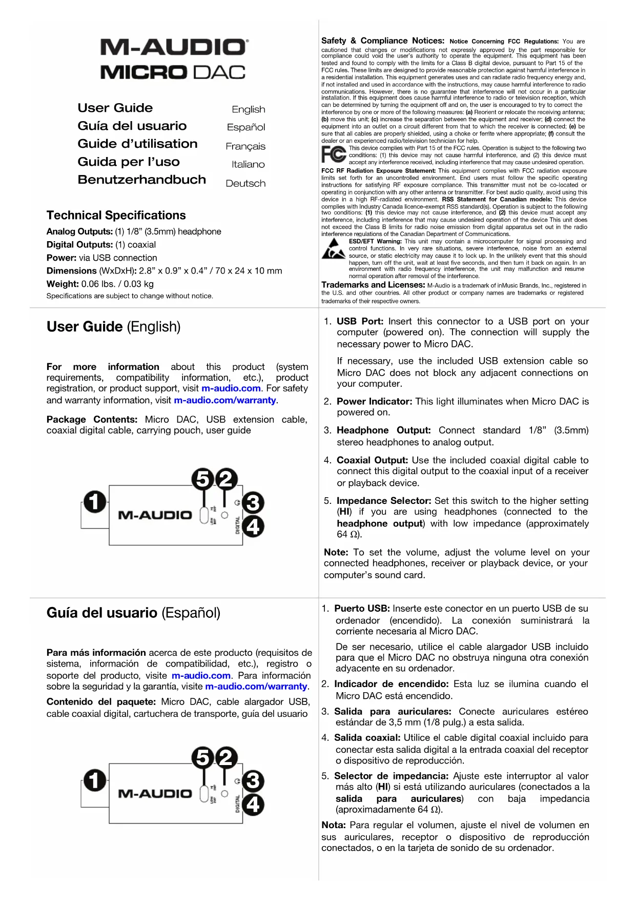 5Guide d’utilisation (Français) Pour plus d’informations sur la configuration système requise, la compatibilité, etc., l’enregistrement du produit ou de l’assistance technique concernant ce produit, veuillez visiter m-audio.com. Pour consulter les consignes de sécurité et informations concernant la garantie, veuillez visiter le site m-audio.com/warranty. Contenu de l’emballage : Micro DAC, câble de prolongation USB, câble coaxial numérique, pochette de transport, guide d’utilisation