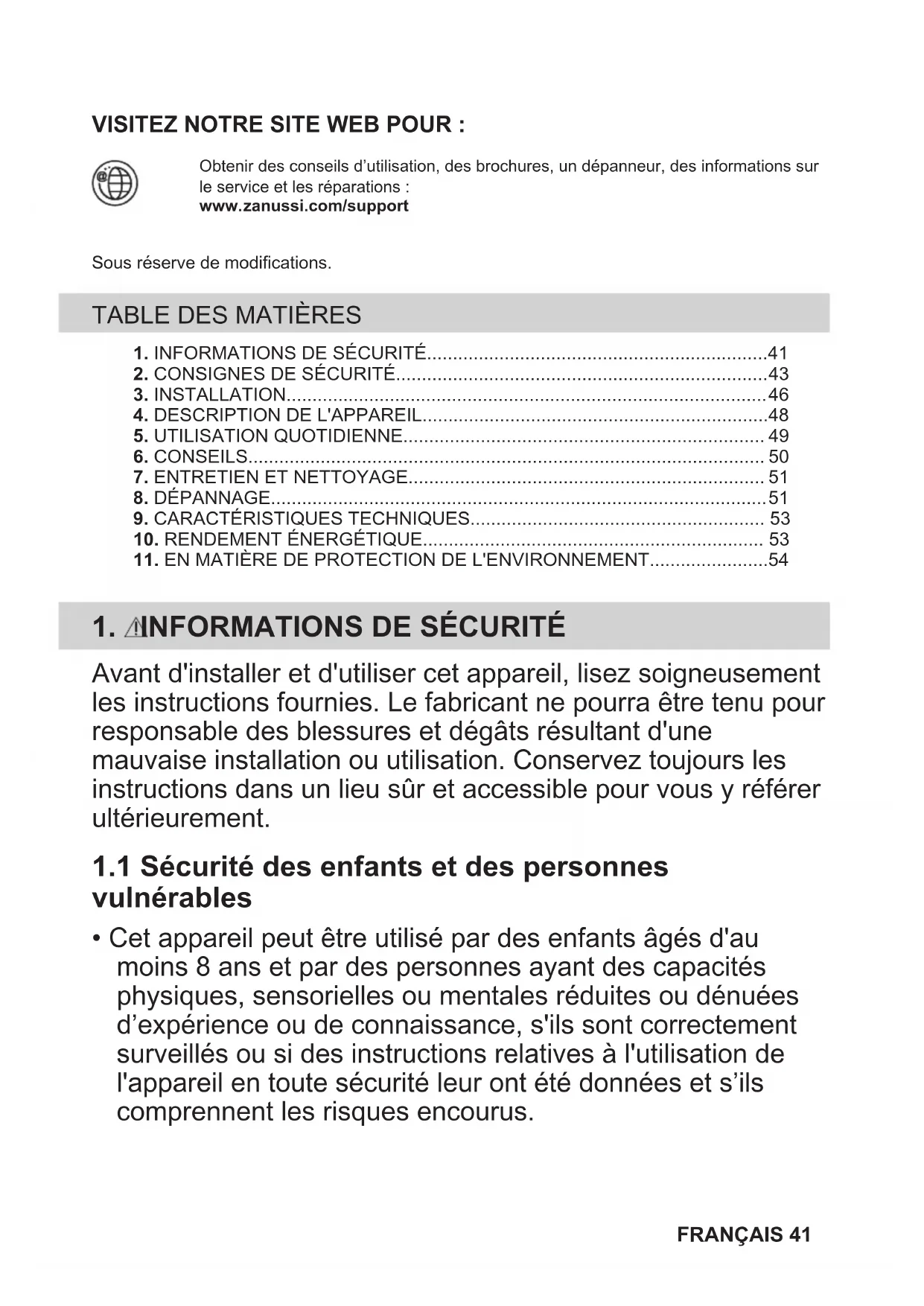 Recyclez les matériaux portant le symbole . Déposez les emballages dans les conteneurs prévus à cet effet. Contribuez à la protection de l'environnement et à votre sécurité, recyclez vos produits électriques et électroniques. Ne jetez pas les appareils portant le symbole avec les ordures ménagères. Emmenez un tel produit dans votre centre local de recyclage ou contactez vos services municipaux. Concerne la France uniquement : 54 FRANÇAISBESUCHEN SIE UNSERE WEBSITE, UM: Anwendungshinweise, Prospekte, Informationen zu Fehlerbehebung, Service undReparatur zu erhalten:www.zanussi.com/supportÄnderungen vorbehalten. INHALTSVERZEICHNIS