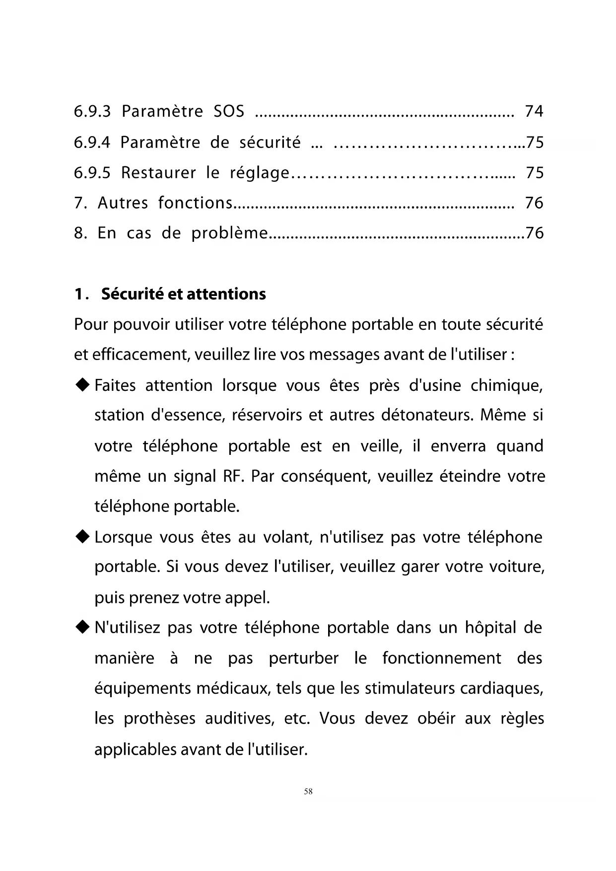 1.Sécurité et attentions Pour pouvoir utiliser votre téléphone portable en toute sécurité et efficacement, veuillez lire vos messages avant de l'utiliser : Faites attention lorsque vous êtes près d'usine chimique, station d'essence, réservoirs et autres détonateurs. Même si votre téléphone portable est en veille, il enverra quand même un signal RF. Par conséquent, veuillez éteindre votre téléphone portable. Lorsque vous êtes au volant, n'utilisez pas votre téléphone portable. Si vous devez l'utiliser, veuillez garer votre voiture, puis prenez votre appel. N'utilisez pas votre téléphone portable dans un hôpital de manière à ne pas perturber le fonctionnement des équipements médicaux, tels que les stimulateurs cardiaques, les prothèses auditives, etc. Vous devez obéir aux règles applicables avant de l'utiliser.59 Veuillez éteindre votre téléphone portable avant de prendre l'avion de manière à ne pas perturber le vol. Il est dangereux et illégal d'utiliser un téléphone portable à bord. Veuillez placer votre téléphone portable et tous les accessoires hors de la portée des enfants. Accessoires et batterie : veuillez utiliser l'accessoire dédié et la batterie de notre société. Le cas échéant, il existe un risque de détérioration du téléphone et de danger. Veuillez ne pas court-circuiter, démolir ou adapter la batterie. Si le téléphone a une température excessive, se décolore, varie, gonfle, fuit et autres phénomènes inhabituels, veuillez cesser de l'utiliser et changer la batterie immédiatement afin de ne pas compromettre la sécurité. Veuillez placer les anciennes piles dans des endroits de recyclage spécifiques. Pas de chargement sans la batterie. Lorsque vous retirez la batterie, veuillez éteindre le téléphone portable, afin de ne pas détruire le téléphone. Le téléphone n'est pas étanche. Veuillez le garder au sec. Évitez d'utiliser le téléphone dans une température excessive ou trop basse. Ne jetez pas, ne faites pas tomber et ne frappez pas le téléphone afin de ne pas détruire l’intérieur et l’extérieur du60 téléphone. Réparation : faites installer et réparer le téléphone par des professionnels. Veuillez ne pas ouvrir le téléphone vous-même. L'unité de comptage du niveau de rayonnement s'appelle SAR. Dans la norme internationale, la limitation du SAR est de 2,0 W/Kg. La valeur SAR maximale de ce téléphone est de 0,482 W/Kg. Elle répond au critère d'état de Go 21288-2007.