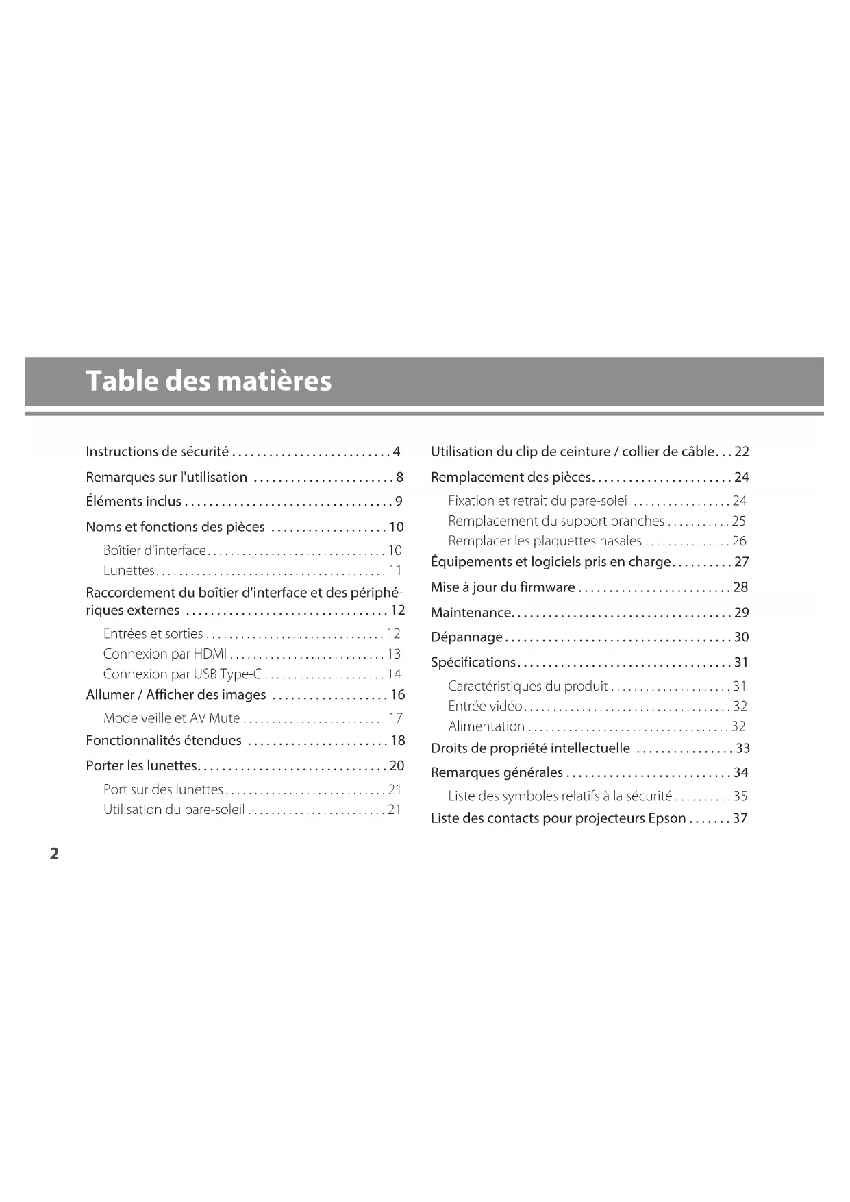 Liste des contacts pour projecteurs Epson. 37