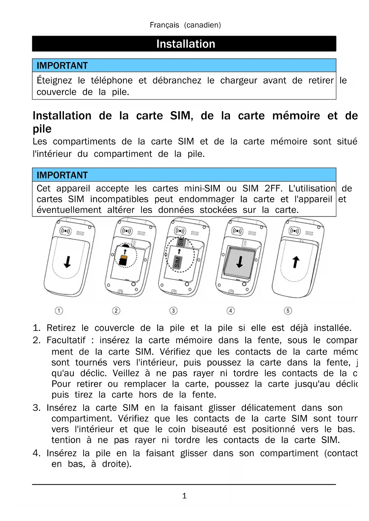 Cet appareil accepte les cartes mini-SIM ou SIM 2FF. L'utilisation de cartes SIM incompatibles peut endommager la carte et l'appareil et eventuellement ALTERER les données stockées sur la carte.