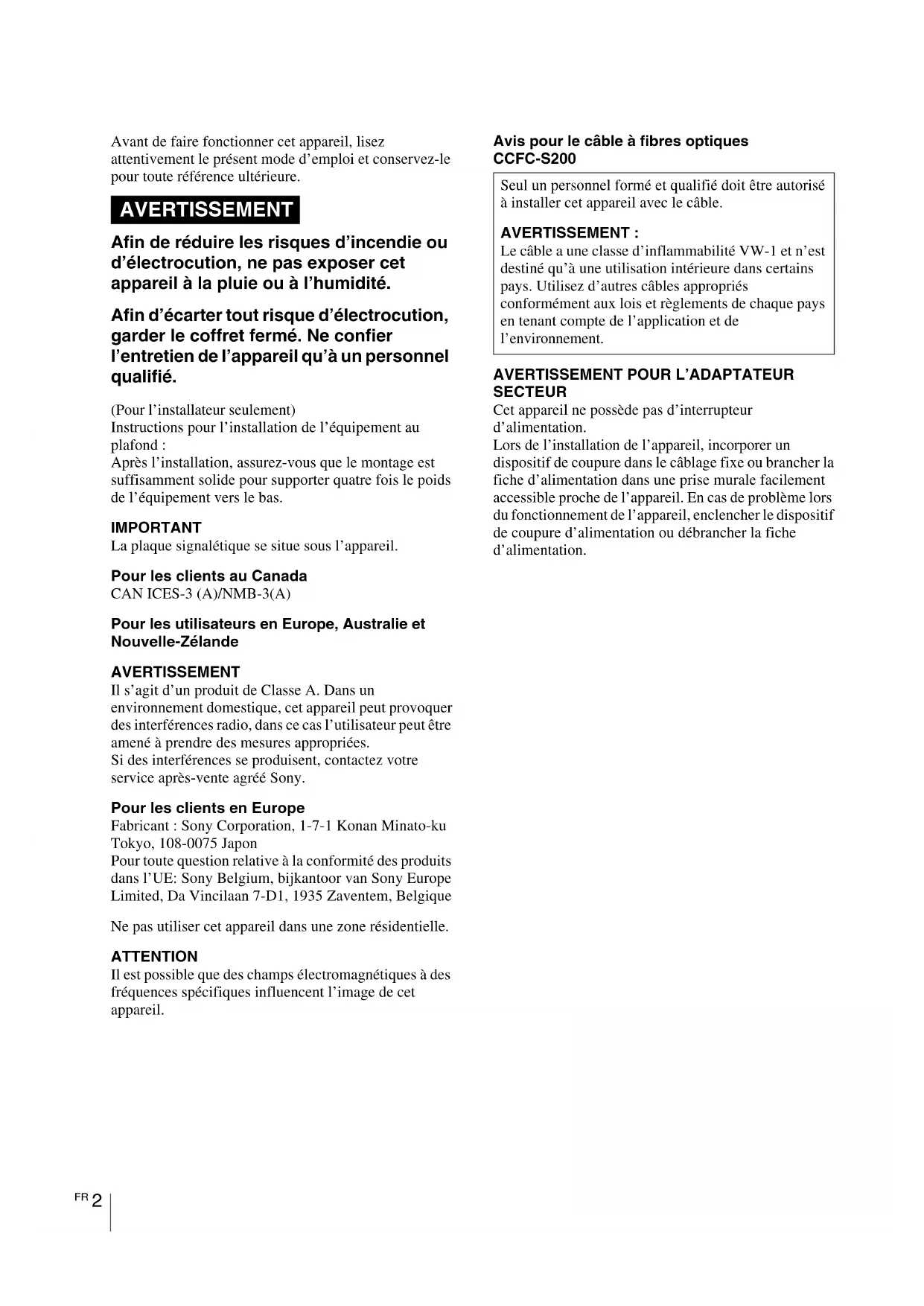 Avant de faire fonctionner cet appareil, lisez attentivement le présent mode d’emploi et conservez-le pour toute référence ultérieure. Afin de réduire les risques d’incendie ou d’électrocution, ne pas exposer cet appareil à la pluie ou à l’humidité. Afin d’écarter tout risque d’électrocution, garder le coffret fermé. Ne confier l’entretien de l’appareil qu’à un personnel qualifié. (Pour l’installateur seulement) Instructions pour l’installation de l’équipement au plafond : Après l’installation, assurez-vous que le montage est suffisamment solide pour supporter quatre fois le poids de l’équipement vers le bas. IMPORTANT La plaque signalétique se situe sous l’appareil. Pour les clients au Canada CAN ICES-3 (A)/NMB-3(A) Pour les utilisateurs en Europe, Australie et Nouvelle-Zélande AVERTISSEMENT Il s’agit d’un produit de Classe A. Dans un environnement domestique, cet appareil peut provoquer des interférences radio, dans ce cas l’utilisateur peut être amené à prendre des mesures appropriées. Si des interférences se produisent, contactez votre service après-vente agréé Sony. Pour les clients en Europe Fabricant : Sony Corporation, 1-7-1 Konan Minato-ku Tokyo, 108-0075 Japon Pour toute question relative à la conformité des produits dans l’UE: Sony Belgium, bijkantoor van Sony Europe Limited, Da Vincilaan 7-D1, 1935 Zaventem, Belgique Ne pas utiliser cet appareil dans une zone résidentielle. ATTENTION Il est possible que des champs électromagnétiques à des fréquences spécifiques influencent l’image de cet appareil. Avis pour le câble à fibres optiques CCFC-S200
