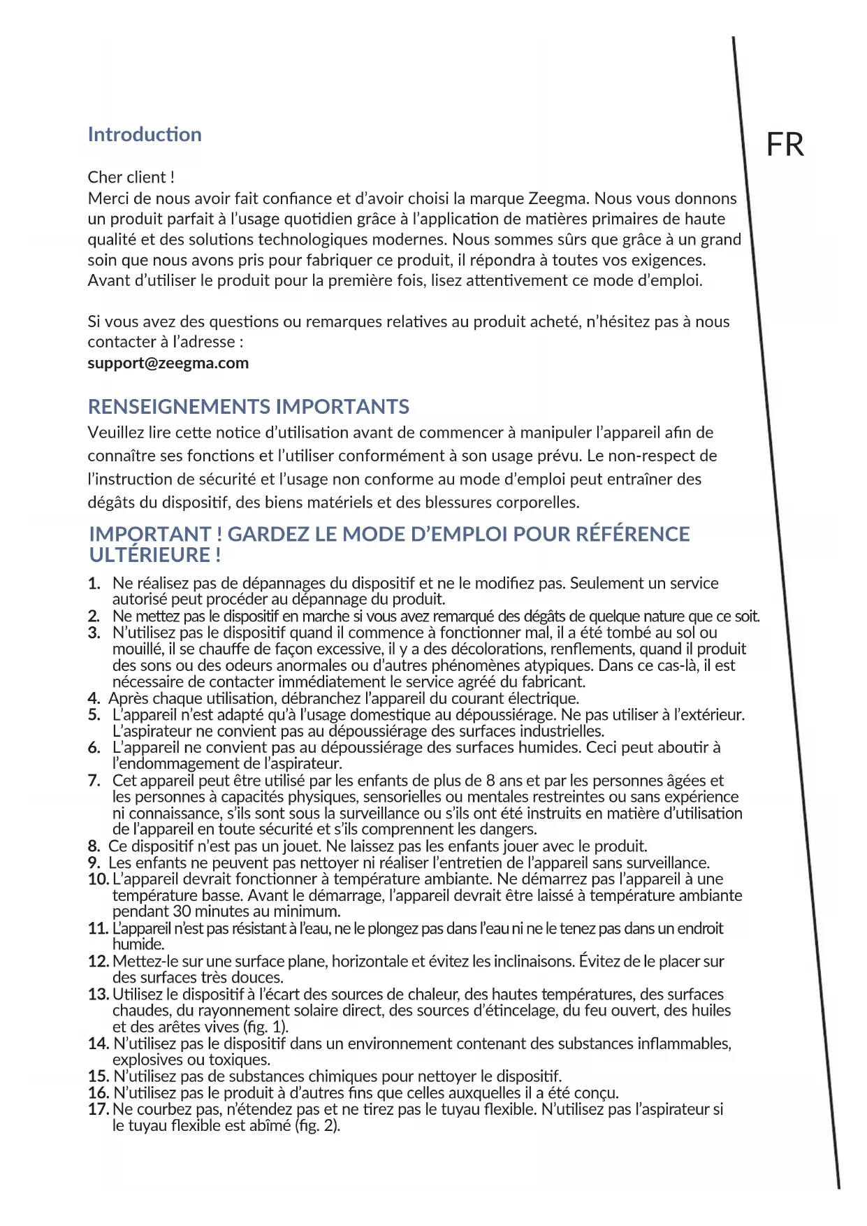 1FR Introducon Cher client ! Merci de nous avoir fait conance et d’avoir choisi la marque Zeegma. Nous vous donnons un produit parfait à l’usage quodien grâce à l’applicaon de maères primaires de haute qualité et des soluons technologiques modernes. Nous sommes sûrs que grâce à un grand soin que nous avons pris pour fabriquer ce produit, il répondra à toutes vos exigences. Avant d’uliser le produit pour la première fois, lisez aenvement ce mode d’emploi. Si vous avez des quesons ou remarques relaves au produit acheté, n’hésitez pas à nous contacter à l’adresse : support@zeegma.com RENSEIGNEMENTS IMPORTANTS Veuillez lire cee noce d’ulisaon avant de commencer à manipuler l’appareil an de connaître ses foncons et l’uliser conformément à son usage prévu. Le non-respect de l’instrucon de sécurité et l’usage non conforme au mode d’emploi peut entraîner des dégâts du disposif, des biens matériels et des blessures corporelles. IMPORTANT ! GARDEZ LE MODE D’EMPLOI POUR RÉFÉRENCE ULTÉRIEURE !