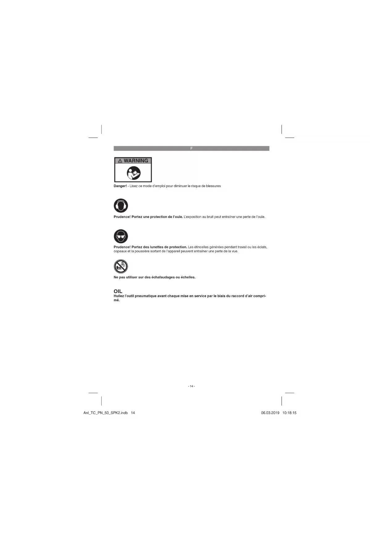 Danger! - Lisez ce mode d’emploi pour diminuer le risque de blessures Prudence! Portez une protection de l’ouïe. L’exposition au bruit peut entraîner une perte de l’ouïe. Prudence! Portez des lunettes de protection. Les étincelles générées pendant travail ou les éclats, copeaux et la poussière sortant de l’appareil peuvent entraîner une perte de la vue. Ne pas utiliser sur des échafaudages ou échelles. OIL Huilez l’outil pneumatique avant chaque mise en service par le biais du raccord d’air compri- mé. Anl_TC_PN_50_SPK2.indb 14Anl_TC_PN_50_SPK2.indb 14 06.03.2019 10:18:1506.03.2019 10:18:15F