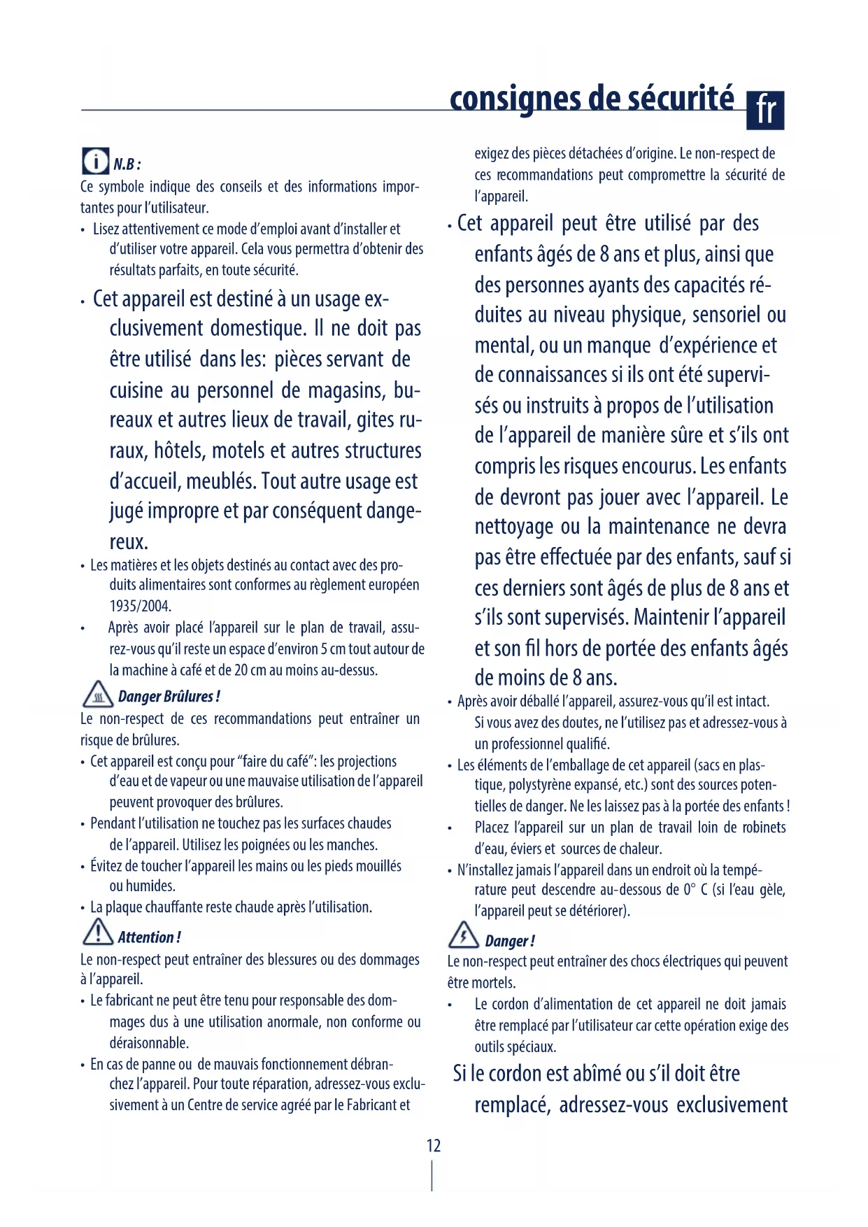 - Cet appareil est conçu pour “faire du café”: les projections d’eau et de vapeur ou une mauvaise utilisation de l’appareil peuvent provoquer des brûlures.