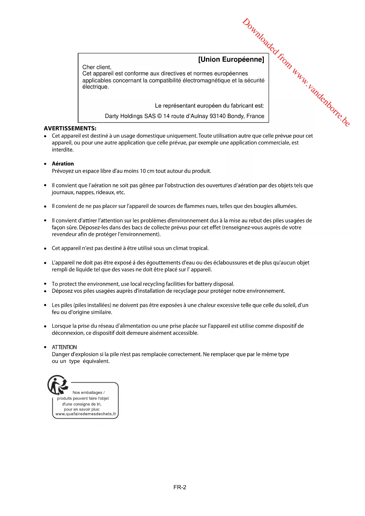 un type équivalent. [Union Européenne] Cher client, Cet appareil est conforme aux directives et normes européennes applicables concernant la compatibilité électromagnétique et la sécurité électrique. Le représentant européen du fabricant est: Darty Holdings SAS © 14 route d’Aulnay 93140 Bondy, France Nos emballages / produits peuvent faire l'objet d'une consigne de tri, pour en savoir plus: Downloaded from www.vandenborre.be FR-2DESCRIPTION
