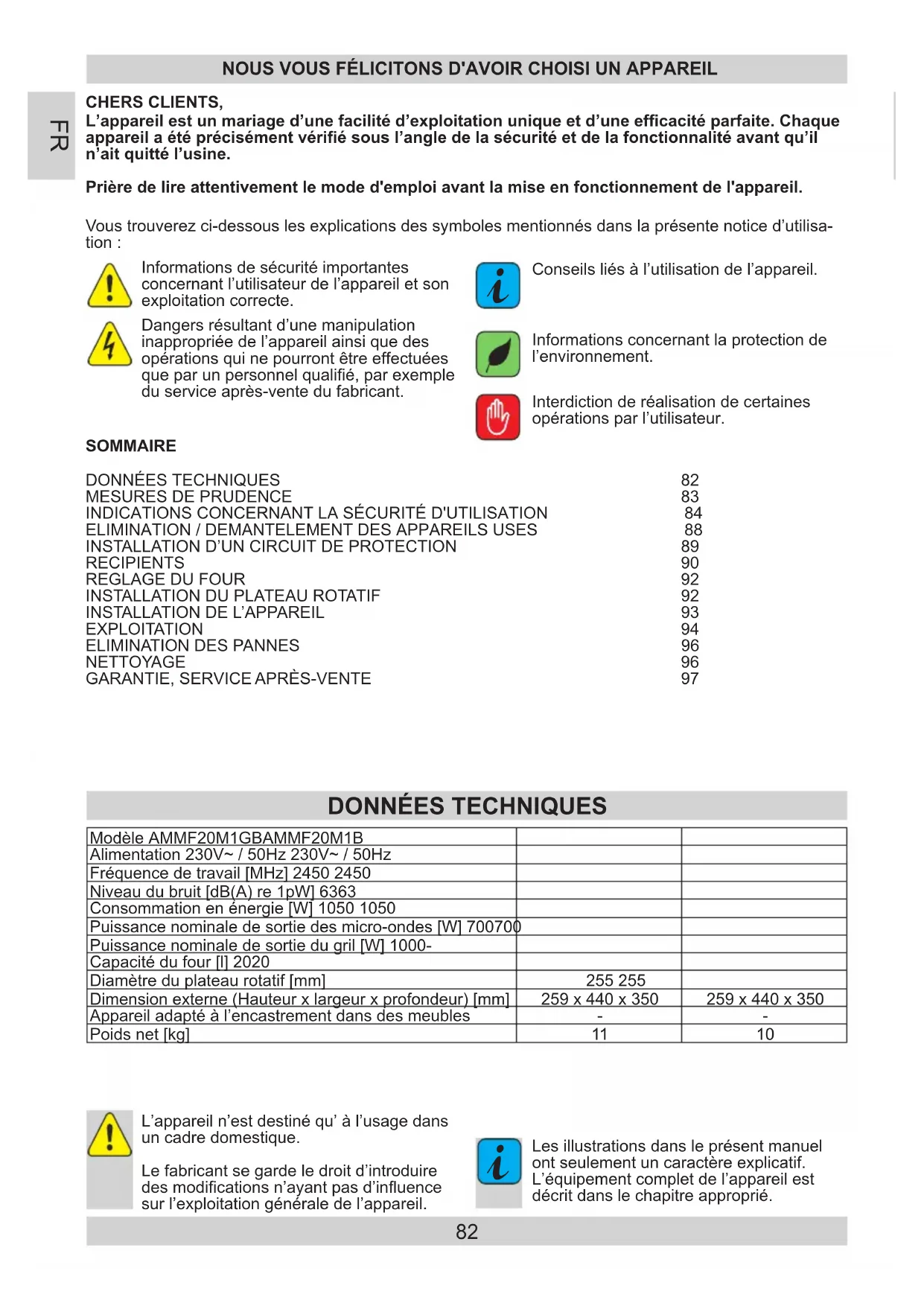 Les illustrations dans le présent manuel ont seulement un caractère explicatif. L’équipement complet de l’appareil est décrit dans le chapitre approprié.Modèle AMMF20M1GB AMMF20M1BAlimentation 230V~ / 50Hz 230V~ / 50HzFréquence de travail [MHz] 2450 2450Niveau du bruit [dB(A) re 1pW] 63 63Consommation en énergie [W] 1050 1050Puissance nominale de sortie des micro-ondes [W] 700 700Puissance nominale de sortie du gril [W] 1000 -Capacité du four [l] 20 20Diamètre du plateau rotatif [mm] 255 255 Dimension externe (Hauteur x largeur x profondeur) [mm] 259 x 440 x 350 259 x 440 x 350 Appareil adapté à l’encastrement dans des meubles - - Poids net [kg] 11 10
