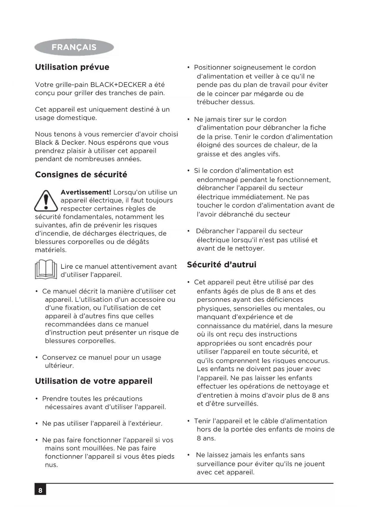 - You can check the location of your nearest authorised repair agent by contacting your local Black+Decker oce at the address indicated in this manual. Alternatively, a list of authorized Black+Decker repair agents and full details of our after-sales service and contact are available on the Internet at: www.2helpU.com.7 FRANÇAIS8 FRANÇAIS Utilisation prévue Votre grille-pain BLACK+DECKER a été conçu pour griller des tranches de pain. Cet appareil est uniquement destiné à un usage domestique. Nous tenons à vous remercier d’avoir choisi Black & Decker. Nous espérons que vous prendrez plaisir à utiliser cet appareil pendant de nombreuses années. Consignes de sécurité Avertissement! Lorsqu’on utilise un appareil électrique, il faut toujours respecter certaines règles de sécurité fondamentales, notamment les suivantes, afin de prévenir les risques d’incendie, de décharges électriques, de blessures corporelles ou de dégâts matériels. Lire ce manuel attentivement avant d’utiliser l’appareil.