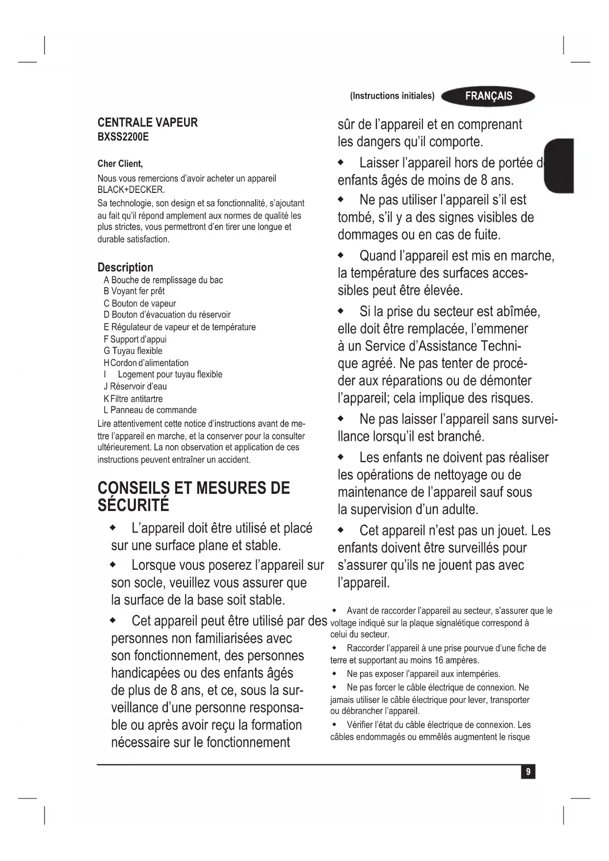 CENTRALE VAPEUR BXSS2200E Cher Client, Nous vous remercions d’avoir acheter un appareil BLACK+DECKER. Sa technologie, son design et sa fonctionnalité, s’ajoutant au fait qu’il répond amplement aux normes de qualité les plus strictes, vous permettront d’en tirer une longue et durable satisfaction. Description A Bouche de remplissage du bac B Voyant fer prêt C Bouton de vapeur D Bouton d’évacuation du réservoir E Régulateur de vapeur et de température F Support d’appui GTuyauexible H Cordon d’alimentation I Logementpourtuyauexible J Réservoir d’eau K Filtre antitartre L Panneau de commande Lire attentivement cette notice d’instructions avant de me- ttre l’appareil en marche, et la conserver pour la consulter ultérieurement. La non observation et application de ces instructions peuvent entraîner un accident.