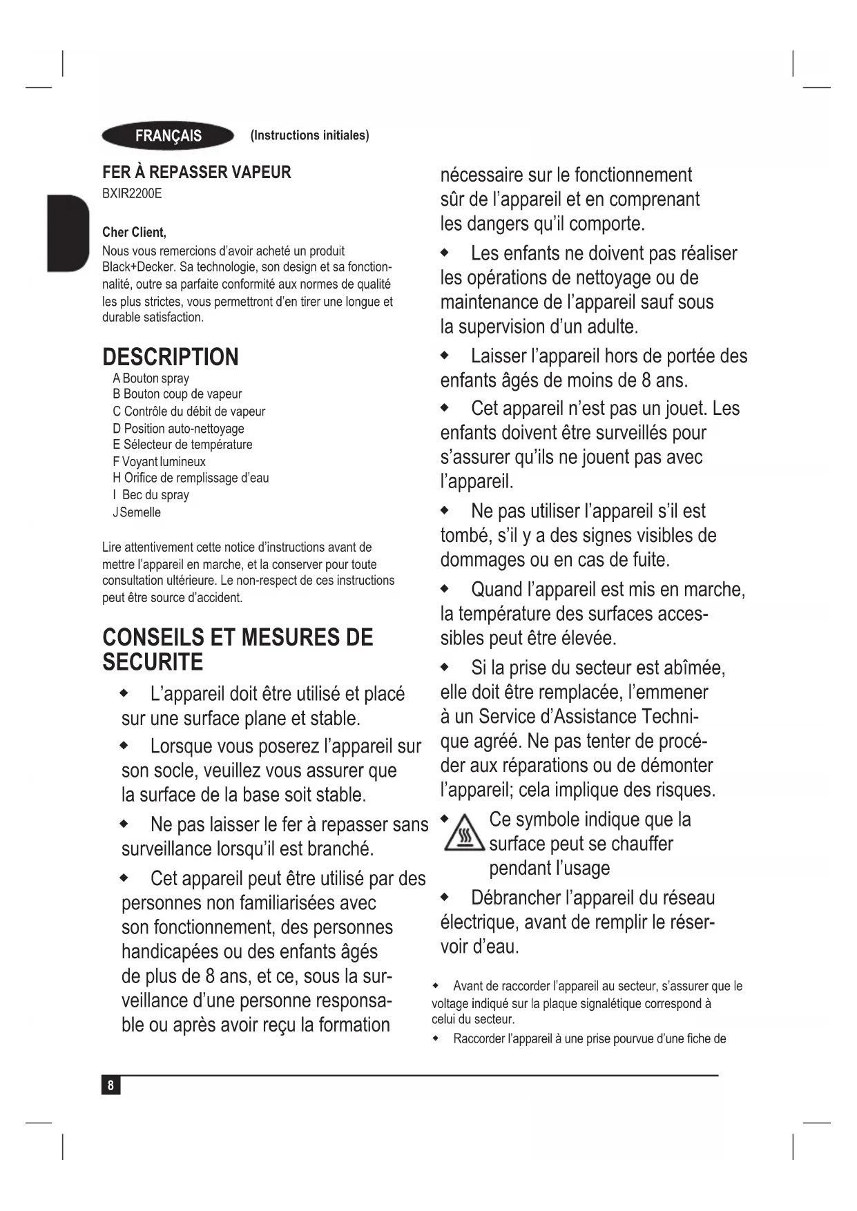 BXIR2200E Cher Client, Nous vous remercions d’avoir acheté un produit Black+Decker. Sa technologie, son design et sa fonction- nalité, outre sa parfaite conformité aux normes de qualité les plus strictes, vous permettront d’en tirer une longue et durable satisfaction. DESCRIPTION A Bouton spray B Bouton coup de vapeur C Contrôle du débit de vapeur D Position auto-nettoyage E Sélecteur de température F Voyant lumineux HOricederemplissaged’eau I Bec du spray J Semelle Lire attentivement cette notice d’instructions avant de mettre l’appareil en marche, et la conserver pour toute consultation ultérieure. Le non-respect de ces instructions peut être source d’accident.