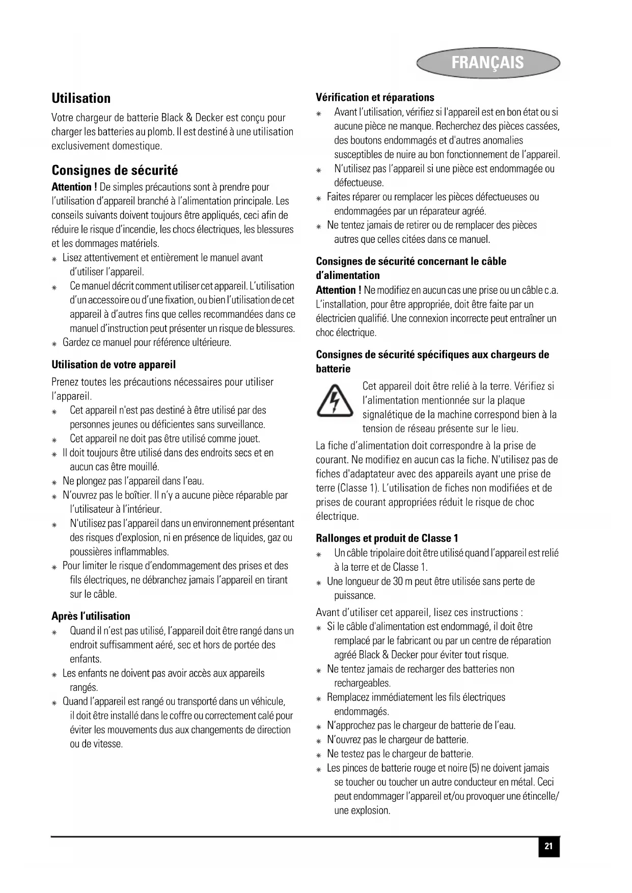 BDV1085 - Chargeur de batterie BLACK & DECKER - Notice d'utilisation et mode d'emploi gratuit