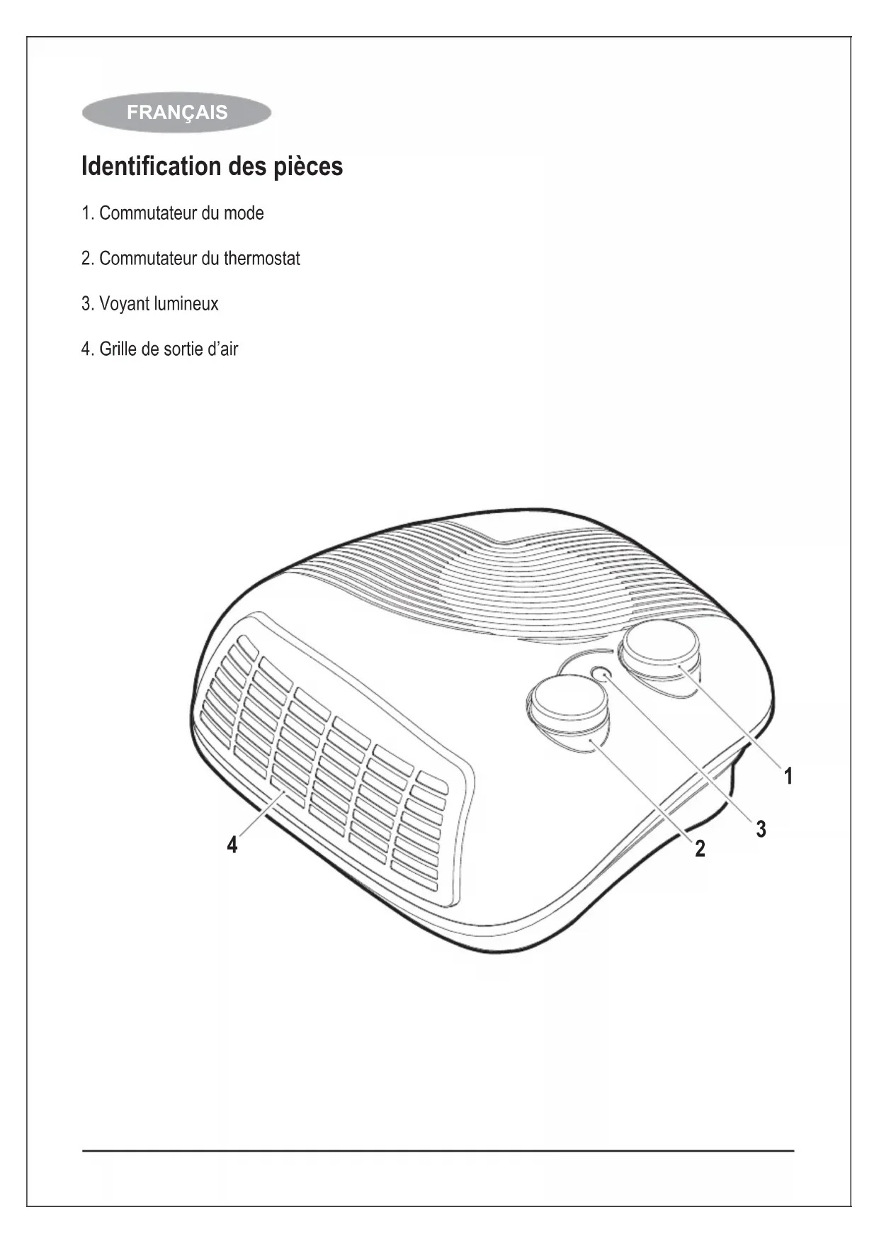 - Tout fusible de rechange doit être du même calibre que le fusible d’origine livré avec l’appareil. Réglage du mode Le ventilateur du radiateur comporte un bouton rotatif de réglage, et vous pouvez sélectionner différents types d’air en le tournant dans le sens horaire sur: Arrêt (Off) Ventilation seule Air chaud Air très chaud Thermostat Lorsque le mode de chauffage est sélectionné