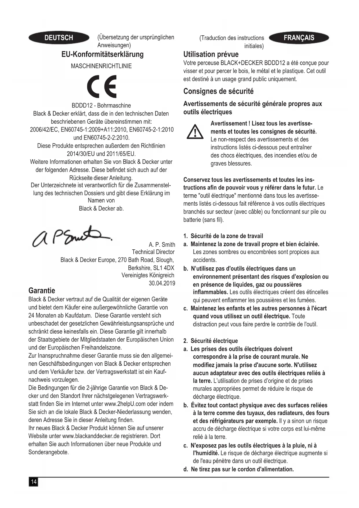 Le soussigné est responsable de la compilation du chier technique et fait cette déclaration au nom de Black & Decker. A. P. Smith Directeur technique Black & Decker Europe, 270 Bath Road, Slough, Berkshire, SL1 4DX Royaume-Uni 30/04/2019 Garantie Black & Decker est sûr de la qualité de ses produits et offre une garantie de 24 mois aux utilisateurs, à partir de la date d'achat. Cette garantie s'ajoute à vos droits légaux auxquels elle ne porte aucunement préjudice. Cette garantie est valable au sein des territoires des États membres de l’Union Euro- péenne et au sein de la Zone européenne de libre-échange. Pour prétendre à la garantie, la réclamation doit être en conformité avec les conditions générales de Black & Decker et vous devez fournir une preuve d'achat au vendeur ou au réparateur agréé. Les conditions générales de la garantie de 2 ans Black & Decker ainsi que l'adresse du réparateur agrée le plus proche sont disponibles sur le site Internet www.2helpU.com ou en contactant votre agence Black & Decker locale à l'adresse indiquée dans ce manuel. Veuillez consulter notre site Internet www.blackanddecker. co.uk pour enregistrer votre nouveau produit Black & Decker et pour être tenu informé des nouveaux produits et offres spéciales. (Traduzione del testo originale) ITALIANO Uso previsto Il trapano/avvitatore BDDD12 BLACK+DECKER è stato progettato per avvitare e per forare legno, metallo e plastica. Questo attrezzo è destinato esclusivamente all'uso privato. Istruzioni di sicurezza Avvertenze di sicurezza generali per gli elettrou- tensili