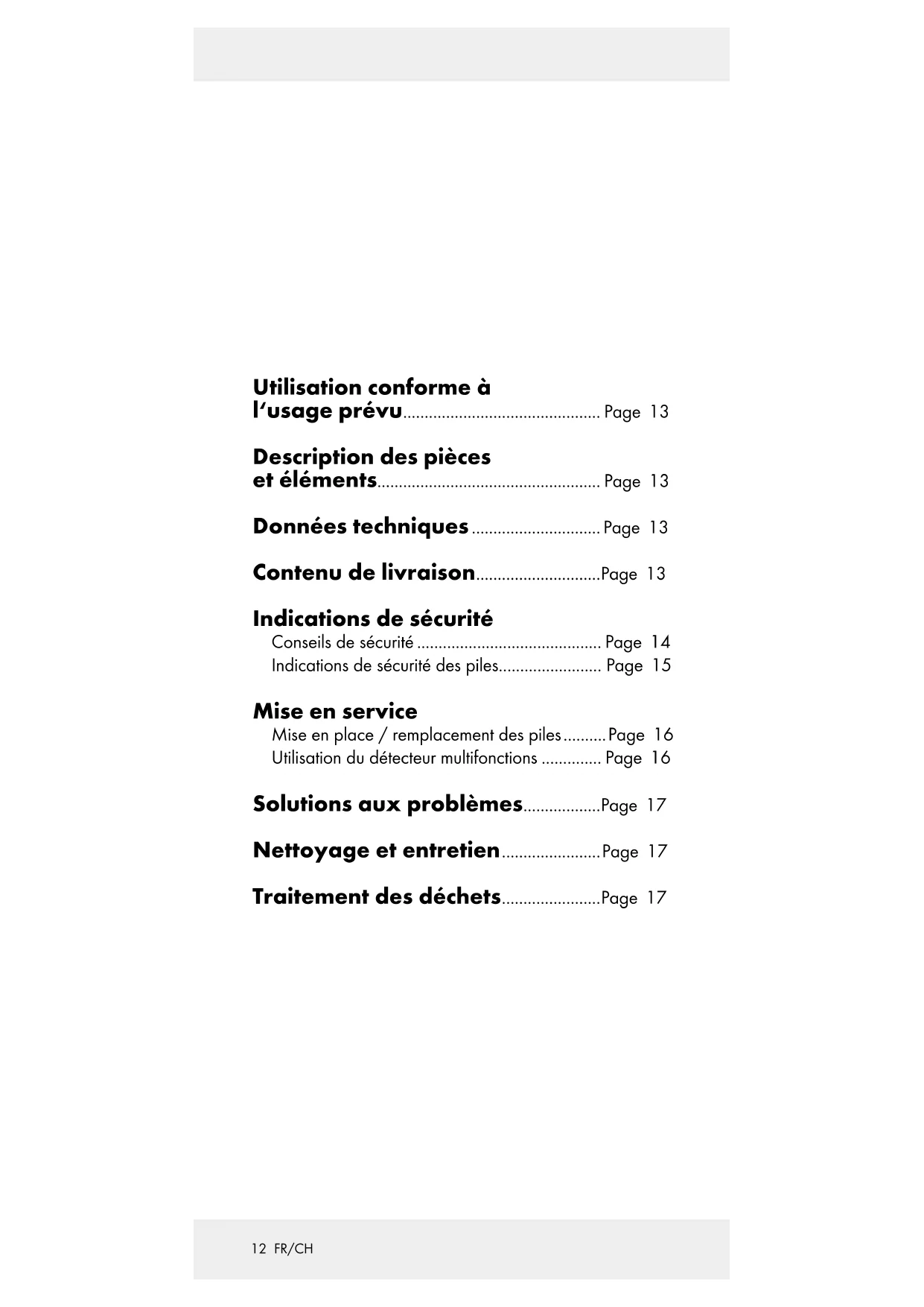 Contenu de livraison Contrôlez immédiatement après le déballage l‘intégralité du contenu de la livraison, ainsi que l‘état irréprochable de l‘appareil. 1 détecteur multifonctions 2 piles, 1,5 V , AAA 1 mode d’emploi14 FR/CH