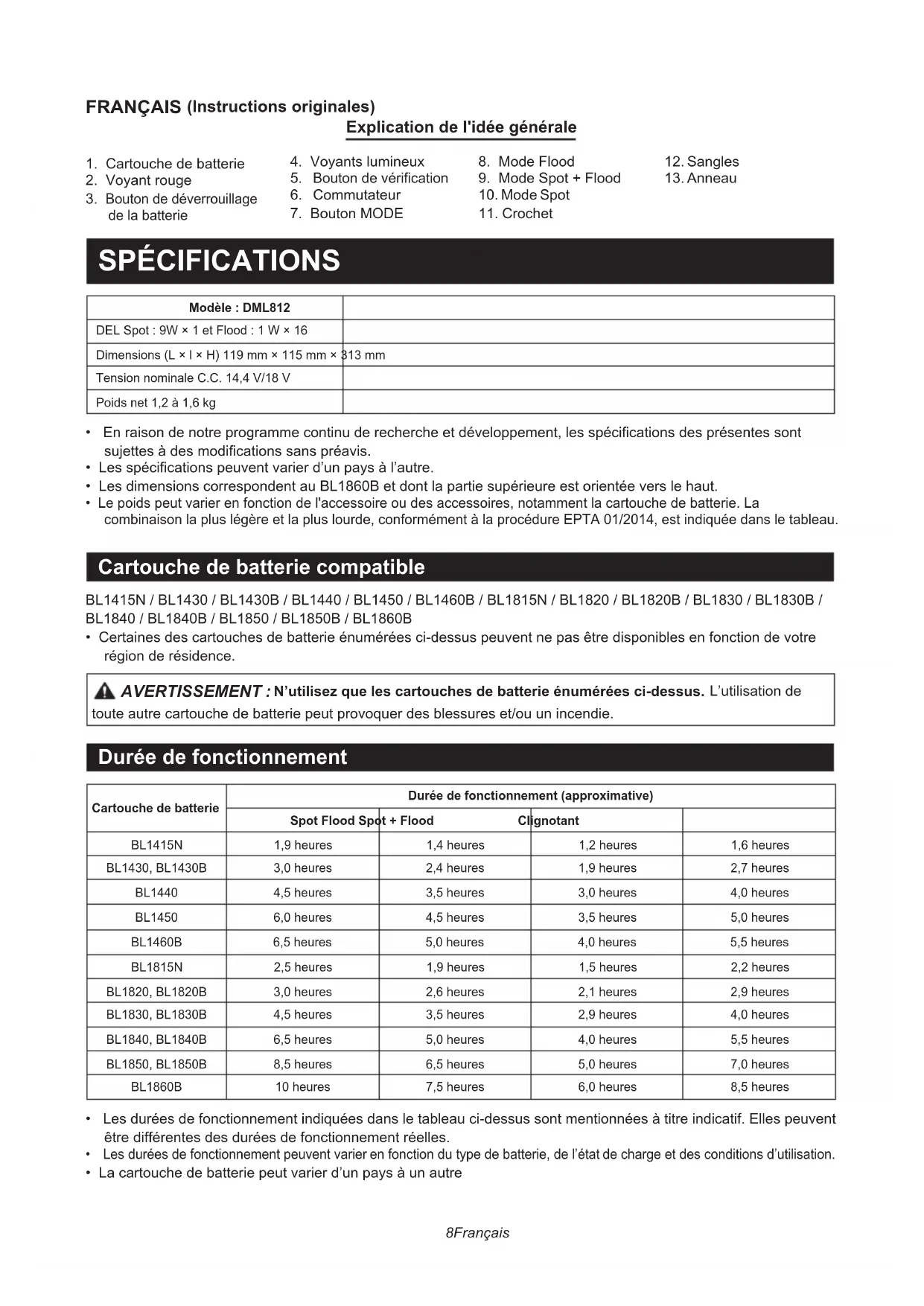 N’utilisez que les cartouches de batterie énumérées ci-dessus. L’utilisation de toute autre cartouche de batterie peut provoquer des blessures et/ou un incendie. Durée de fonctionnement Cartouche de batterieDurée de fonctionnement (approximative)Spot Flood Spot + Flood Clignotant BL1415N 1,9 heures 1,4 heures 1,2 heures 1,6 heures BL1430, BL1430B 3,0 heures 2,4 heures 1,9 heures 2,7 heures BL1440 4,5 heures 3,5 heures 3,0 heures 4,0 heures BL1450 6,0 heures 4,5 heures 3,5 heures 5,0 heures BL1460B 6,5 heures 5,0 heures 4,0 heures 5,5 heures BL1815N 2,5 heures 1,9 heures 1,5 heures 2,2 heures BL1820, BL1820B 3,0 heures 2,6 heures 2,1 heures 2,9 heures BL1830, BL1830B 4,5 heures 3,5 heures 2,9 heures 4,0 heures BL1840, BL1840B 6,5 heures 5,0 heures 4,0 heures 5,5 heures BL1850, BL1850B 8,5 heures 6,5 heures 5,0 heures 7,0 heures BL1860B 10 heures 7,5 heures 6,0 heures 8,5 heures