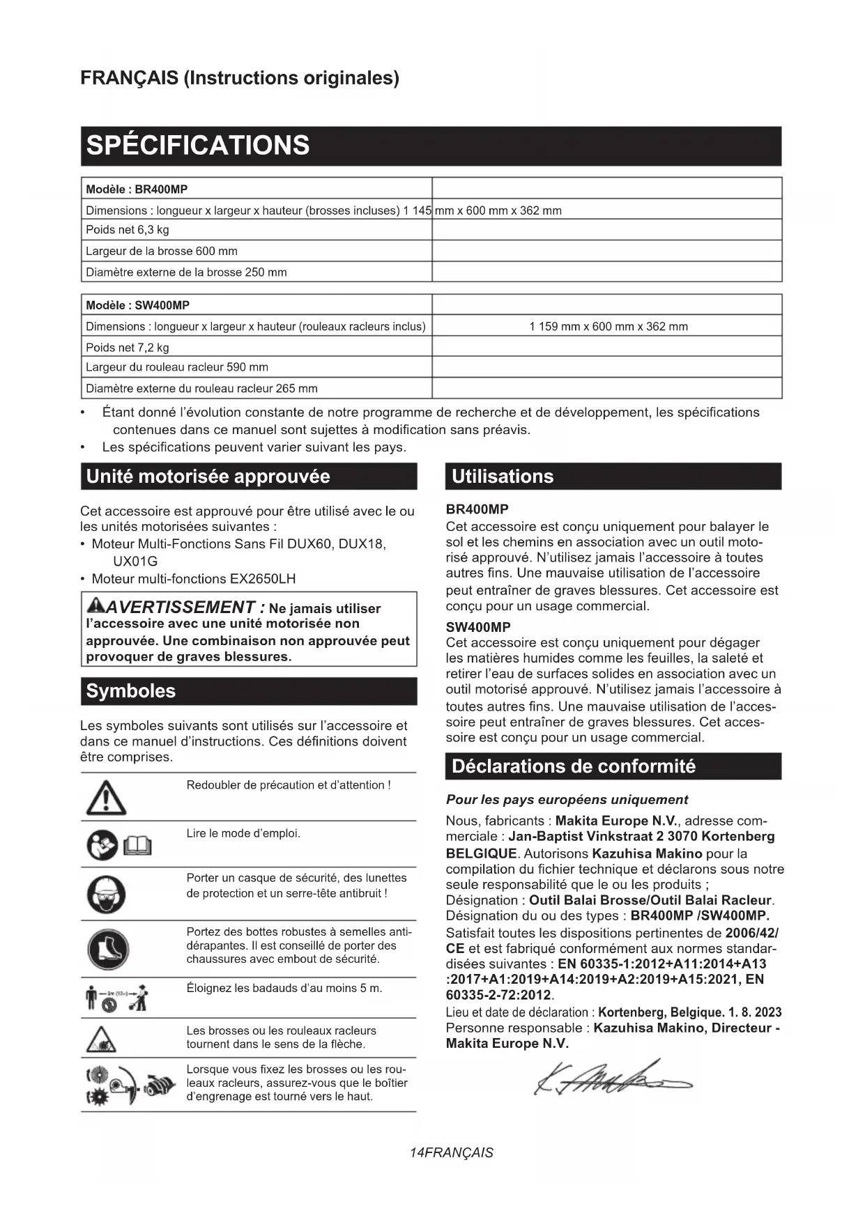 l’accessoire avec une unité motorisée non approuvée. Une combinaison non approuvée peut provoquer de graves blessures. Symboles Lessymbolessuivantssontutiliséssurl’accessoireet danscemanueld’instructions.Cesdénitionsdoivent être comprises. Redoubler de précaution et d’attention ! Lire le mode d’emploi. Porteruncasquedesécurité,deslunettes de protection et un serre-tête antibruit ! Portezdesbottesrobustesàsemellesanti- dérapantes. Il est conseillé de porter des chaussures avec embout de sécurité. Éloignez les badauds d’au moins 5 m. Les brosses ou les rouleaux racleurs tournentdanslesensdelaèche. Lorsquevousxezlesbrossesoulesrou- leauxracleurs,assurez-vousqueleboîtier d’engrenage est tourné vers le haut. Utilisations BR400MP Cetaccessoireestconçuuniquementpourbalayerle sol et les chemins en association avec un outil moto- riséapprouvé.N’utilisezjamaisl’accessoireàtoutes autresns.Unemauvaiseutilisationdel’accessoire peutentraînerdegravesblessures.Cetaccessoireest conçu pour un usage commercial. SW400MP Cetaccessoireestconçuuniquementpourdégager les matières humides comme les feuilles, la saleté et retirer l’eau de surfaces solides en association avec un outilmotoriséapprouvé.N’utilisezjamaisl’accessoireà toutesautresns.Unemauvaiseutilisationdel’acces- soirepeutentraînerdegravesblessures.Cetacces- soire est conçu pour un usage commercial. Déclarations de conformité Pour les pays européens uniquement Nous, fabricants : Makita Europe N.V., adresse com- merciale : Jan-Baptist Vinkstraat 2 3070 Kortenberg BELGIQUE. Autorisons Kazuhisa Makino pour la compilationduchiertechniqueetdéclaronssousnotre seuleresponsabilitéqueleoulesproduits; Désignation : Outil Balai Brosse/Outil Balai Racleur. Désignationduoudestypes:BR400MP /SW400MP. Satisfait toutes les dispositions pertinentes de 2006/42/ CEetestfabriquéconformémentauxnormesstandar- disées suivantes : EN 60335-1:2012+A11:2014+A13 :2017+A1:2019+A14:2019+A2:2019+A15:2021, EN 60335-2-72:2012. Lieu et date de déclaration : Kortenberg, Belgique. 1. 8. 2023 Personne responsable : Kazuhisa Makino, Directeur - Makita Europe N.V.15 FRANÇAIS CONSIGNES DE SÉCURITÉ Consignes de sécurité pour balai brosse/balai racleur