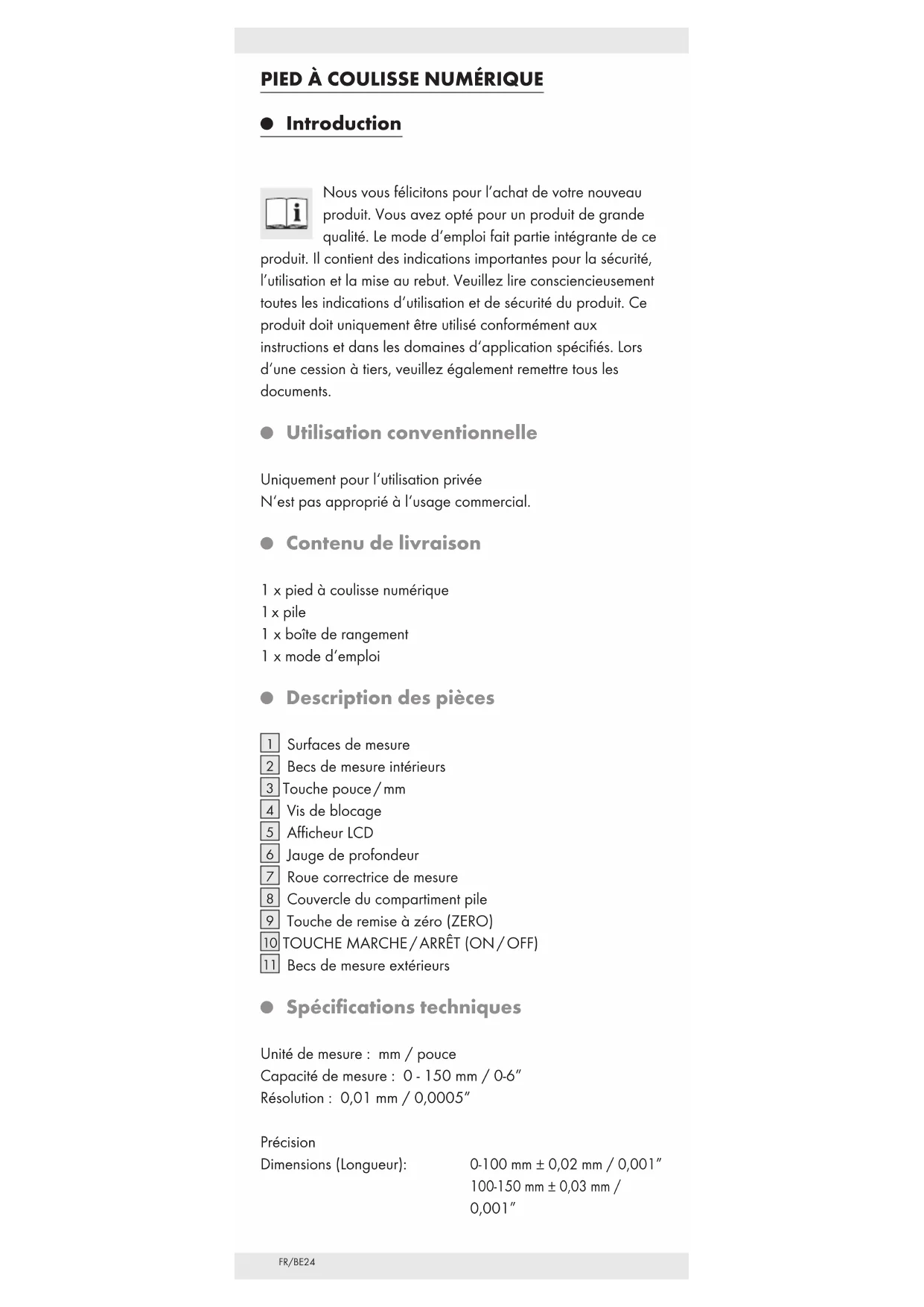 Spécifications techniques Unité de mesure : mm / pouce Capacité de mesure : 0 - 150 mm / 0-6” Résolution : 0,01 mm / 0,0005” Précision Dimensions (Longueur): 0-100 mm ± 0,02 mm / 0,001” 100-150 mm ± 0,03 mm / 0,001”FR/BE 25 Dimensions (Profondeur): 0-100 mm ± 0,04 mm / 0,002” 100-150 mm ± 0,05 mm / 0,002” Vitesse maximum de mesure : 1,5 m / s, 60”/s Système de mesure : linéaire, sans contact Système de mesure CAP Affichage : afficheur LCD Température de fonctionnement : +5 °C - +40 °C Influence de l‘humidité ambiante : de 0 % à 80 % d‘humidité relative Pile : 3 V CR2032 (comprise) Indications de sécurité VEUILLEZ S‘IL VOUS PLAÎT LIRE LE MODE D‘EMPLOI AVANT L‘UTILISATON !