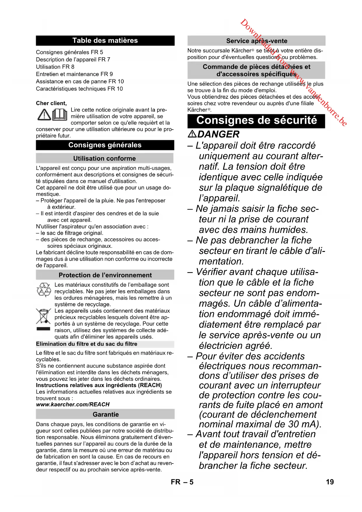 DANGER – L'appareil doit être raccordé uniquement au courant alter- natif. La tension doit être identique avec celle indiquée sur la plaque signalétique de l’appareil. – Ne jamais saisir la fiche sec- teur ni la prise de courant avec des mains humides. – Ne pas debrancher la fiche secteur en tirant le câble d'ali- mentation. – Vérifier avant chaque utilisa- tion que le câble et la fiche secteur ne sont pas endom- magés. Un câble d’alimenta- tion endommagé doit immé- diatement être remplacé par le service après-vente ou un électricien agréé. – Pour éviter des accidents électriques nous recomman- dons d’utiliser des prises de courant avec un interrupteur de protection contre les cou- rants de fuite placé en amont (courant de déclenchement nominal maximal de 30 mA). – Avant tout travail d'entretien et de maintenance, mettre l'appareil hors tension et dé- brancher la fiche secteur. Table des matières Consignes générales FR 5Description de l’appareil FR 7Utilisation FR 8Entretien et maintenance FR 9Assistance en cas de panne FR 10Caractéristiques techniques FR 10 Consignes générales Utilisation conforme Protection de l’environnement Elimination du filtre et du sac du filtre Garantie Service après-vente Commande de pièces détachées et d'accessoires spécifiques Consignes de sécurité 19FR Downloaded from www.vandenborre.be– 6 – Seul le service après-vente agréé est autorisé à effectuer des travaux de réparation ou des travaux concernant les pièces électriques de l'appareil. AVERTISSEMENT – Cet appareil n'est pas destiné à être utilisé par des per- sonnes ayant des capacités physiques, sensorielles ou mentales réduites ou man- quant d'expérience et/ou de connaissances, sauf si ces mêmes personnes sont sous la supervision d'une per- sonne responsable de leur sécurité ou ont été formées à l'utilisation de l'appareil. – Des enfants ne peuvent utili- ser l'appareil que s'ils ont plus de 8 ans et s'ils sont sous la surveillance d'une personne compétence ou s'ils ont reçu de sa part des instructions d'utilisation de l'appareil et s'ils ont compris les dangers qui peuvent en résulter. – Les enfants ne doivent pas jouer avec l'appareil. – Surveiller les enfants pour s'assurer qu'ils ne jouent pas avec l'appareil. – Le nettoyage et la mainte- nance par l'utilisateur ne doivent pas être effectués par des enfants sans surveillance. – Tenir les films plastiques d'emballages hors de portée des enfants, risque d'étouffe- ment ! – Mettre l'appareil hors service après chaque utilisation et avant chaque nettoyage/en- tretien. – Risque d'incendie. N’aspirer aucun objet enflammé ou in- candescent. – Il est interdit d’utiliser l’appa- reil dans des zones présen- tant des risques d’explosion. – En cas de formation de mousse ou de fuite, éteindre immédiate- ment l'appareil ou bien débran- cher la prise secteur! – N'utiliser aucun produit mous- sant, pour vitres ou multi- usage ! Ne jamais plonger l'appareil dans l'eau. Des substances déterminées peuvent provoquer la formation de vapeurs ou de mélanges ex- plosifs par tourbillonnement avec l’air aspiré. Ne jamais aspirer les subs- tances suivantes: – Des gazes, liquides et pous- sières (poussières réactives) explosifs ou inflammables – Poussières réactives de mé- tal (p.ex. aluminium, magné- sium, zinc) en rapport avec des détergents alcalins et acides – Acides forts et lessives non diluées – Solvants organiques (p.ex. essence, dilutif de couleur, acétone, fuel). Par ailleurs, elles peuvent s’avé- rer agressives pour les maté- riaux utilisés sur l’appareil. 20 FR Downloaded from www.vandenborre.be– 7 DANGER Signale la présence d'un danger imminent entraînant de graves blessures corporelles et pou- vant avoir une issue mortelle. 몇 AVERTISSEMENT Signale la présence d'une situa- tion éventuellement dangereuse pouvant entraîner de graves blessures corporelles et même avoir une issue mortelle. 몇 PRÉCAUTION Remarque relative à une situa- tion potentiellement dangereuse pouvant entraîner des blessures légères. ATTENTION Remarque relative à une situa- tion éventuellement dangereuse pouvant entraîner des dom- mages matériels. Pour les illustrations, voir les pages dépliantes ! Ces instructions de service dé-crivent l'aspirateur multi-usage décrit sur la page de garde. Les illustrations montrant l'équipement complet, il peut y avoir des différences au niveau de l'équipe-ment et des accessoires livrés, suivant le modèle.Contrôler le matériel lors du déballage pour constater des accessoires manquants ou des dommages. Si des dégâts dus au transport sont constatés, il faut en infor-mer le revendeur. inclus dans la fournitureaccessoires possiblesIllustration Pour le raccord du tuyau d'aspiration lors de l'aspi-ration.Illustration Position I : aspirer ou souffler.Position 0: appareil hors circuit.Illustration Position MAXI : aspirer ou souffler. Position MAXI : aspiration avec outil élec-trique raccordé Réglage de puissance : si nécessaire, réduire la puissance d'aspiration lors de l'aspiration, du souf-flage ou de travaux avec un outil électrique. Position 0 : appareil hors circuit. L'outil électrique est alimenté en tension.Remarque : respecter la puissance de connexion maxi (voir le chapitre « Données techniques »).Illustration Pour le raccord d'un outil électrique.Illustration Insérer le flexible d'aspiration dans le raccord de soufflage pour activer la fonction de soufflage.Illustration Pour le nettoyage du filtre plat plissé monté.Remarque :Ne pas activer la touche si le filtre plat plis-sé est humide. Après le déverrouillage, saisir la tête de l'appareil au niveau de la poignée concave et la retirer.Illustration L'étrier support sert simultanément au verrouillage de la tête d'appareil et du réservoir. Pour déver-rouiller l'étrier, le pivoter complètement vers l'