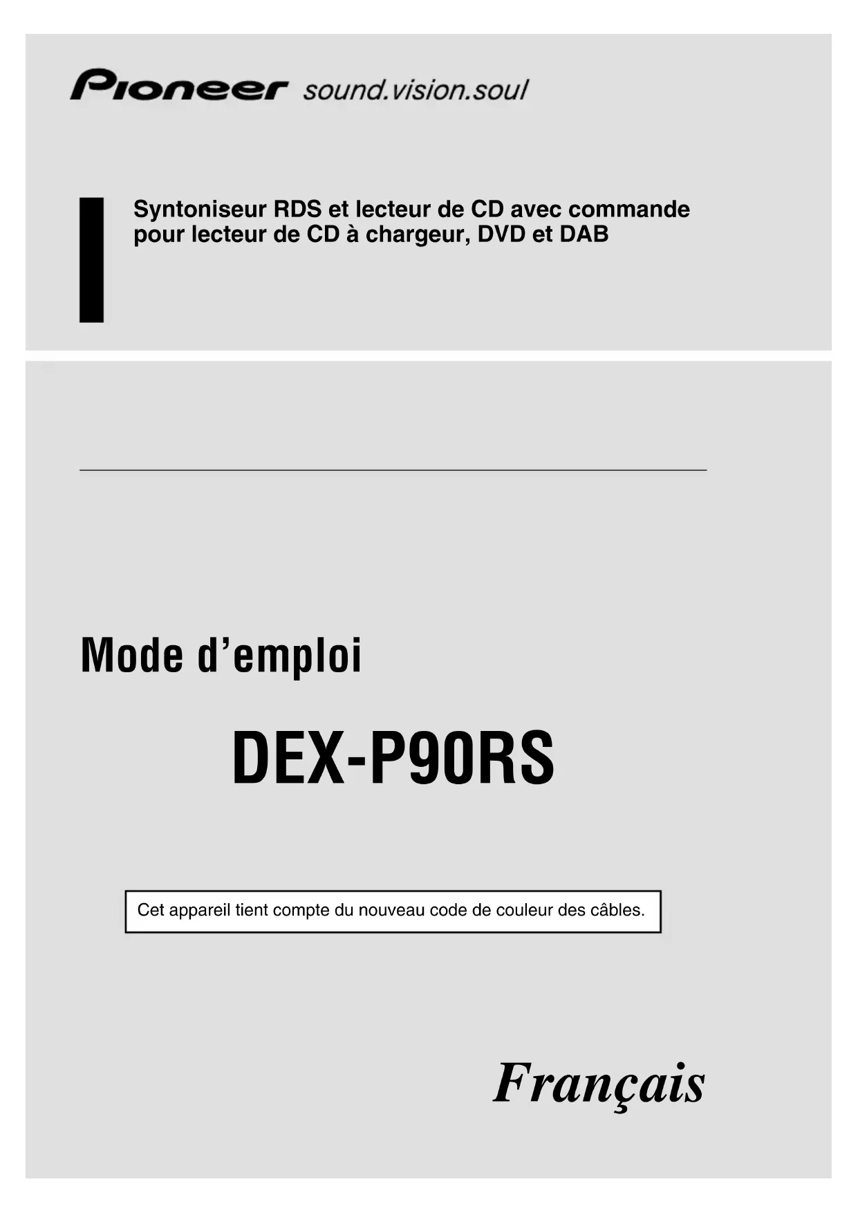 - Syntoniseur RDS et lecteur de CD avec commande pour lecteur de CD à chargeur, DVD et DAB Mode d’emploi DEX-P90RS Cet appareil tient compte du nouveau code de couleur des câbles. Français1 Tables des Matières Tableau des commandes p. 4