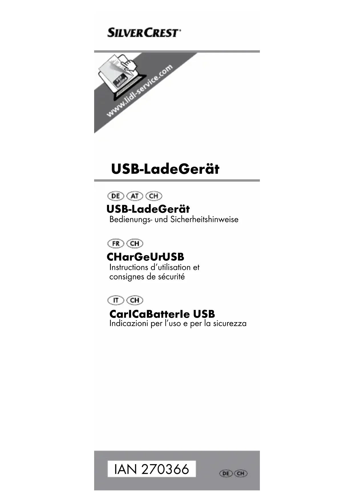 .16 FR/CH IMPORTANT ! Vous pouvez laisser le moteur du véhicule allumé ou éteint pendant que vous utilisez le chargeur auto- mobile. Veuillez uniquement noter que la batterie du véhicule peut se décharger, car l‘appa- reil consomme du courant en mode veille, et ce même lorsque le moteur du véhicule est éteint. Par conséquent, débranchez entièrement l‘appareil du ré- seau électrique après son utilisation. Attention : Pendant la charge, ne mettez en aucun cas l‘allumage en route ou ne l‘éteignez pas car cela peut conduire à des variations ou des pointes de l‘alimentation de tension. Après la charge, déonnectez l‘appareil à charger de l‘adap- tateur USB en débranchant la prise USB de la fiche USB. Retirez l‘adaptateur de la prise. Nettoyage et entretien Avant le nettoyage, débranchez le chargeur USB de la prise !17 FR/CH Utilisez un chiffon sec et non pelucheux pour le nettoyage et l’entretien. Mise au rebut L‘emballage se compose exclusive- ment de matières recyclables, qui peuvent être mises au rebut dans les déchetteries locales. Renseignez-vous auprès de votre mairie ou de votre ville concernant les possibilités de mise au rebut du produit usé. Ne jetez en aucun cas l‘appareil / l‘ar- ticle aux ordures ménagères! Éliminez l’appareil / l’article par l’intermédiaire d’une entreprise d’élimination des ordures agréée, ou par le service de recyclage de votre commune. Respectez les prescriptions en vi- gueur. En cas de doutes, contactez votre organisation de recyclage.18 FR/CH Garantie Indépendamment de la garantie commerciale souscrite, le vendeur reste tenu des défauts de conformité du bien et des vices rédhibitoires dans les conditions prévues aux articles L211-4 et suivants du Code de la consommation et aux articles 1641 et suivants du Code Civil. L’appareil a été fabriqué selon des critères de qualité stricts et contrôlé consciencieusement avant sa livrai- son. En cas de défaillance, vous êtes en droit de retourner ce produit au vendeur. La présente garantie ne constitue pas une restriction de vos droits légaux. Cet appareil bénéficie d‘une ga- rantie de 3ans à compter de sa date d’achat. La durée de garantie débute à la date d’achat. Veuillez conserver le ticket de caisse origi- nal. Il fera office de preuve d’achat. Si un problème matériel ou de fa- brication devait survenir dans 3 ans suivant la date d‘achat de ce produ it, nous assurons à notre discrétion la réparation ou le remplacement de l‘appareil sans frais19 FR/CH supplémentaires. La garantie prend fin si le produit est endom- magé suite à une utilisation inap- propriée ou à un entretien défaillant. La garantie couvre les vices maté riels et de fabrication. Cette garantie ne s’étend pas aux pièces du produit soumises à une usure normale (p. ex. des batteries) et qui, par consé quent, peuvent être considérées comme des pièces d’usure, ni aux dom- mages sur des composants fragiles, comme des interrupteurs, des bat- teries et des éléments fabriqués en verre.20 IT/CH Utilizzo secondo la destinazione d’uso ........................Pagina 21 Descrizione dei componenti .........Pagina 21 Dati tecnici ...........Pagina 21 Contenuto della confezione ...........Pagina 22 Indicazioni di sicurezza .........Pagina 22 Azionamento .....Pagina 23 Pulizia e cura .....Pagina 25 Smaltimento .......Pagina 25 Garanzia ...............Pagina 2621 IT/CH Caricabatterie USB Utilizzo secondo la destinazione d’uso L‘adattatore USB seve a ricaricare dispositivi elettrici la cui alimenta- zione funziona tramite presa USB e che necessitano di una potenza massima di 2100 mA. L‘apparecchio può essere inserito in una presa per veicoli a motore che disponga dell‘alimentazione indicata alla voce „Dati tecnici“. Il prodotto non è indicato per l‘uso aziendale. Il costruttore non si as sume alcuna responsabilità per eventuali danni causati da un impiego non conforme alla destinazione d‘uso. Descrizione dei componenti