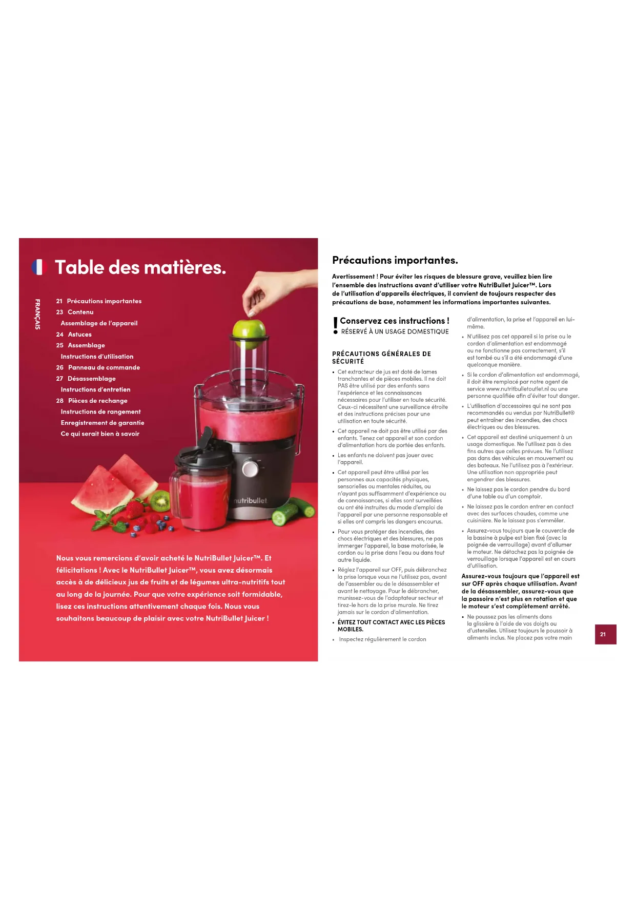 PRÉCAUTIONS GÉNÉRALES DE SÉCURITÉ Cet extracteur de jus est doté de lames tranchantes et de pièces mobiles. Il ne doit PAS être utilisé par des enfants sans l’expérience et les connaissances nécessaires pour l’utiliser en toute sécurité. Ceux-ci nécessitent une surveillance étroite et des instructions précises pour une utilisation en toute sécurité. Cet appareil ne doit pas être utilisé par des enfants. Tenez cet appareil et son cordon d’alimentation hors de portée des enfants. Les enfants ne doivent pas jouer avec l’appareil. Cet appareil peut être utilisé par les personnes aux capacités physiques, sensorielles ou mentales réduites, ou n’ayant pas susamment d’expérience ou de connaissances, si elles sont surveillées ou ont été instruites du mode d’emploi de l’appareil par une personne responsable et si elles ont compris les dangers encourus. Pour vous protéger des incendies, des chocs électriques et des blessures, ne pas immerger l’appareil, la base motorisée, le cordon ou la prise dans l’eau ou dans tout autre liquide. Réglez l’appareil sur OFF, puis débranchez la prise lorsque vous ne l’utilisez pas, avant de l’assembler ou de le désassembler et avant le nettoyage. Pour le débrancher, munissez-vous de l’adaptateur secteur et tirez-le hors de la prise murale. Ne tirez jamais sur le cordon d’alimentation. ÉVITEZ TOUT CONTACT AVEC LES PIÈCES MOBILES. Inspectez régulièrement le cordon d’alimentation, la prise et l’appareil en lui-même. N’utilisez pas cet appareil si la prise ou le cordon d’alimentation est endommagé ou ne fonctionne pas correctement, s’il est tombé ou s’il a été endommagé d’une quelconque manière. Si le cordon d’alimentation est endommagé, il doit être remplacé par notre agent de service www.nutritbulletoutlet.nl ou une personne qualifiée afin d’éviter tout danger. L’utilisation d’accessoires qui ne sont pas recommandés ou vendus par NutriBullet® peut entraîner des incendies, des chocs électriques ou des blessures. Cet appareil est destiné uniquement à un usage domestique. Ne l’utilisez pas à des fins autres que celles prévues. Ne l’utilisez pas dans des véhicules en mouvement ou des bateaux. Ne l’utilisez pas à l’extérieur. Une utilisation non appropriée peut engendrer des blessures. Ne laissez pas le cordon pendre du bord d’une table ou d’un comptoir. Ne laissez pas le cordon entrer en contact avec des surfaces chaudes, comme une cuisinière. Ne le laissez pas s’emmêler. Assurez-vous toujours que le couvercle de la bassine à pulpe est bien fixé (avec la poignée de verrouillage) avant d’allumer le moteur. Ne détachez pas la poignée de verrouillage lorsque l’appareil est en cours d’utilisation.Assurez-vous toujours que l’appareil est sur OFF après chaque utilisation. Avant de la désassembler, assurez-vous que la passoire n’est plus en rotation et que le moteur s’est complètement arrêté. Ne poussez pas les aliments dans la glissière à l’aide de vos doigts ou d’ustensiles. Utilisez toujours le poussoir à aliments inclus. Ne placez pas votre main 21 Précautions importantes23 Contenu Assemblage de l’appareil24 Astuces25 Assemblage Instructions d’utilisation26 Panneau de commande27 Désassemblage Instructions d’entretien 28 Pièces de rechange Instructions de rangement Enregistrement de garantie Ce qui serait bien à savoir Nous vous remercions d’avoir acheté le NutriBullet Juicer™. Et félicitations ! Avec le NutriBullet Juicer™, vous avez désormais accès à de délicieux jus de fruits et de légumes ultra-nutritifs tout au long de la journée. Pour que votre expérience soit formidable, lisez ces instructions attentivement chaque fois. Nous vous souhaitons beaucoup de plaisir avec votre NutriBullet Juicer ! Précautions importantes. Avertissement ! Pour éviter les risques de blessure grave, veuillez bien lire l’ensemble des instructions avant d’utiliser votre NutriBullet Juicer™. Lors de l’utilisation d’appareils électriques, il convient de toujours respecter des précautions de base, notamment les informations importantes suivantes.