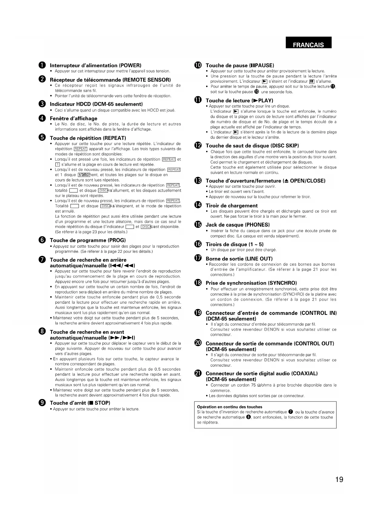 (High Definition Compatible Digital, Compatible Digital Haute Définition) Le HDCD est une technologie de codage/décodage qui réduit considérablement la distorsion survenant lors des enregistrementsdigitaux, tout en restant compatible avec le format CD conventionnel. Le HDCD permet aux données 20-bit d’être converties en données 16-bit des CD courants sans perte de qualité de son. L’utilisation de ce HDCD permet d’atteindre la haute résolution et la basse distorsion caractéristiques du HDCD lors de la lecture de disquescompatibles HDCD, et la technologie digitale de DENON optimise les possibilités de haute qualité de son de la technologie du HDCD. De plus, les CD normaux et les CD compatibles HDCD sont identifiésautomatiquement, et le traitement de signal digital optimum pour ce typede disque est utilisé. (2) Filtre numérique de haute performance Le DCM-65/35 utilise des filtres numériques de haute précision de suréchantillonnage octuple. (3) Lecture simnple des CD simples 8 cm Les CD simples 8 cm peuvent être utilisés sans adaptateur. (4) Programmation jusqu’à 32 plages Toutes les plages d’un disque compact peuvent être programmées pour la lecture dans n’importe quel ordre. La programmation en unités de disque (de toutes les plages sur le disque) est également possible. (5) Mécanisme de changeur de type carrousel nouvellement développé fourni Ce mécanisme peut contenir cinq disques et pendant qu’un disque est en cours de lecture, les quatre disques restants peuvent être changés. De plus, le carrousel peut tourner soit dans le sens des aiguilles d’une montre, soit dans le sens contraire des aiguilles d’une montre, ainsi larecherche entre disques est rapide. (6) Télécommande sans fil accessoire Outre les fonctions générales comme la lecture, l’arrêt et la pause, cette unité de télécommande permet une sélection directe, une programmation directe, une lecture aléatoire et d’autres fonctions. L’unité de télécommande facilite énormément l’utilisation du DCM-65/35, améliorant sa souplesse d’emploi. IMPORTANT (Uniquement modèle pour le marché Canada) Le présent appareil numérique n’émet pas de bruites radioélectriques dépassant les limites applicables aux appareils numériques de la Class B prescrites dans le Réglement sur le brouillage redio- électrique édicté par le ministére des Communications du Canada.NOTE: Ce lecteur CD utilise un laser semi-conducteur. Il est recommandé de l’utiliser dans une pièce où la température est de 10°C (50°F) à 35°C (95°F) pour obtenir un fonctionnement stable et apprécier au maximum la musique.