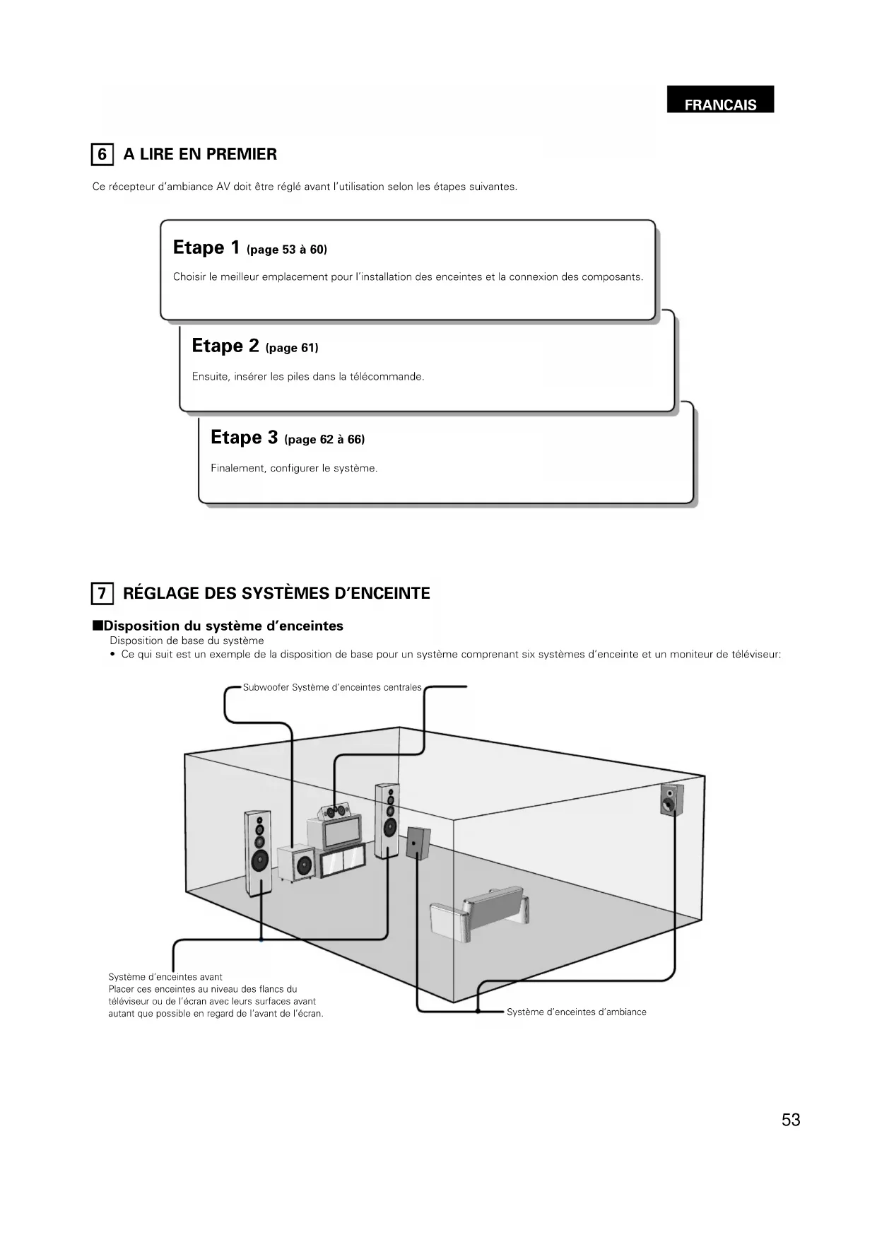 RÉGLAGE DES SYSTÈMES D’ENCEINTE Etape 3 (page 62 à 66) Finalement, configurer le système. Etape 2 (page 61) Ensuite, insérer les piles dans la télécommande. Etape 1 (page 53 à 60) Choisir le meilleur emplacement pour l’installation des enceintes et la connexion des composants.54 FRANCAIS