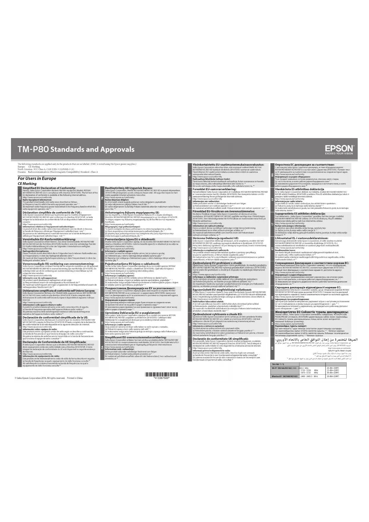 Déclaration simpliée de conformité de l’UE : Seiko Epson Corporation déclare par la présente que les modèles d’équipement M316A/M316B/M316C/M316D sont conformes à la directive 2014/53/UE. Le texte intégral de la déclaration de conformité de l’UE est disponible à l’adresse Internet suivante :http://www.epson.eu/conformityInformations relatives à l’équipement radioélectrique :Ce produit émet des ondes radio intentionnellement comme décrit ci-dessous.(a) bande de fréquence utilisée par l’équipement radioélectrique : voir * (b) puissance de radiofréquence maximale transmise sur la bande de fréquence utilisée par l’équipement radioélectrique : voir *