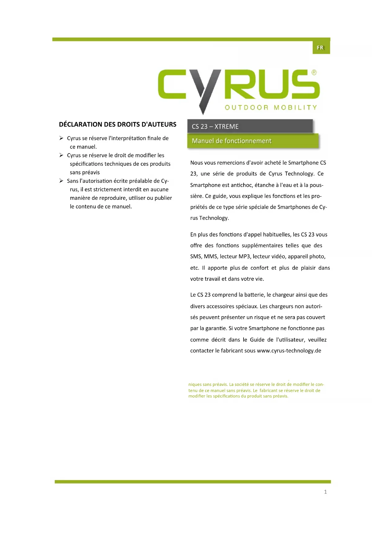 Nous vous remercions d'avoir acheté le Smartphone CS 23, une série de produits de Cyrus Technology. Ce Smartphone est antichoc, étanche à l'eau et à la pous- sière. Ce guide, vous explique les fonctions et les pro- priétés de ce type série spéciale de Smartphones de Cy- rus Technology. En plus des fonctions d'appel habituelles, les CS 23 vous offre des fonctions supplémentaires telles que des SMS, MMS, lecteur MP3, lecteur vidéo, appareil photo, etc. Il apporte plus de confort et plus de plaisir dans votre travail et dans votre vie. Le CS 23 comprend la batterie, le chargeur ainsi que des divers accessoires spéciaux. Les chargeurs non autori- sés peuvent présenter un risque et ne sera pas couvert par la garantie. Si votre Smartphone ne fonctionne pas comme décrit dans le Guide de l'utilisateur, veuillez contacter le fabricant sous www.cyrus-technology.de2