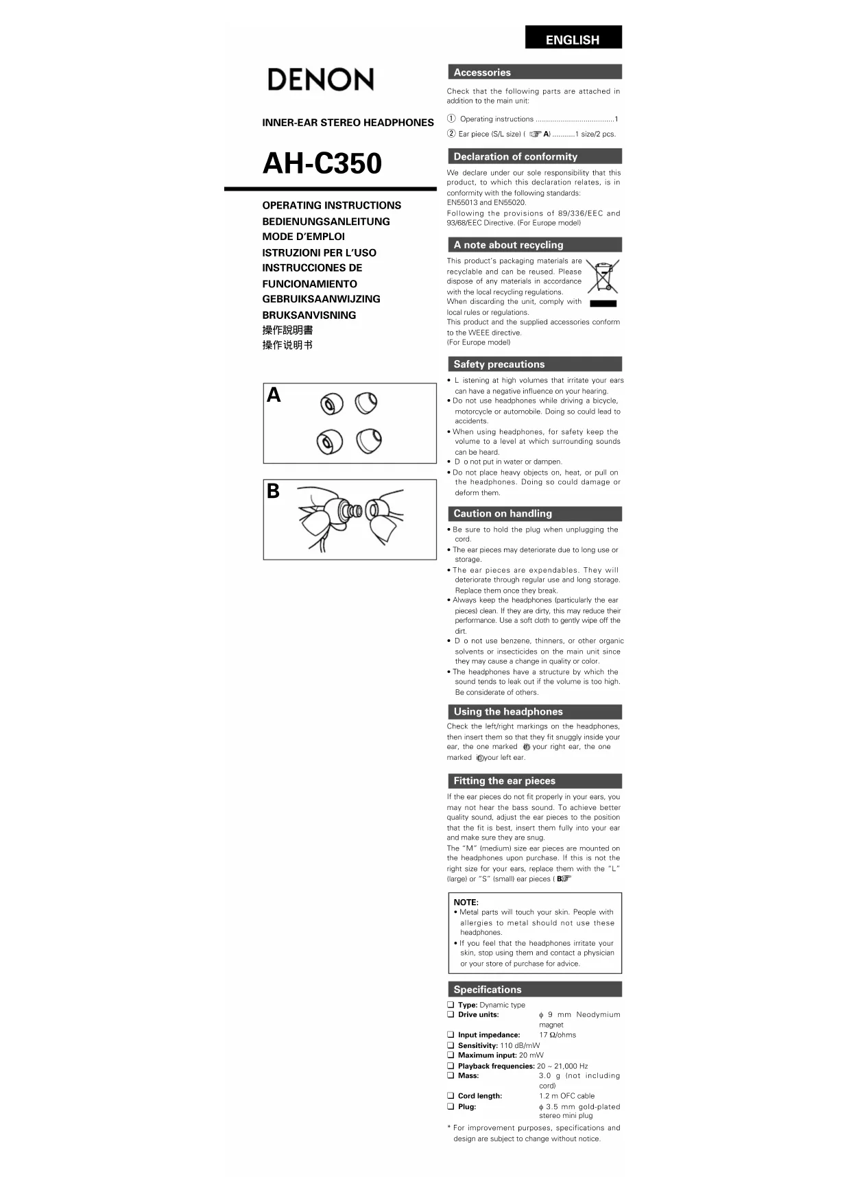 AHC350W - Bouchon d'oreille DENON - Notice d'utilisation et mode d'emploi gratuit
