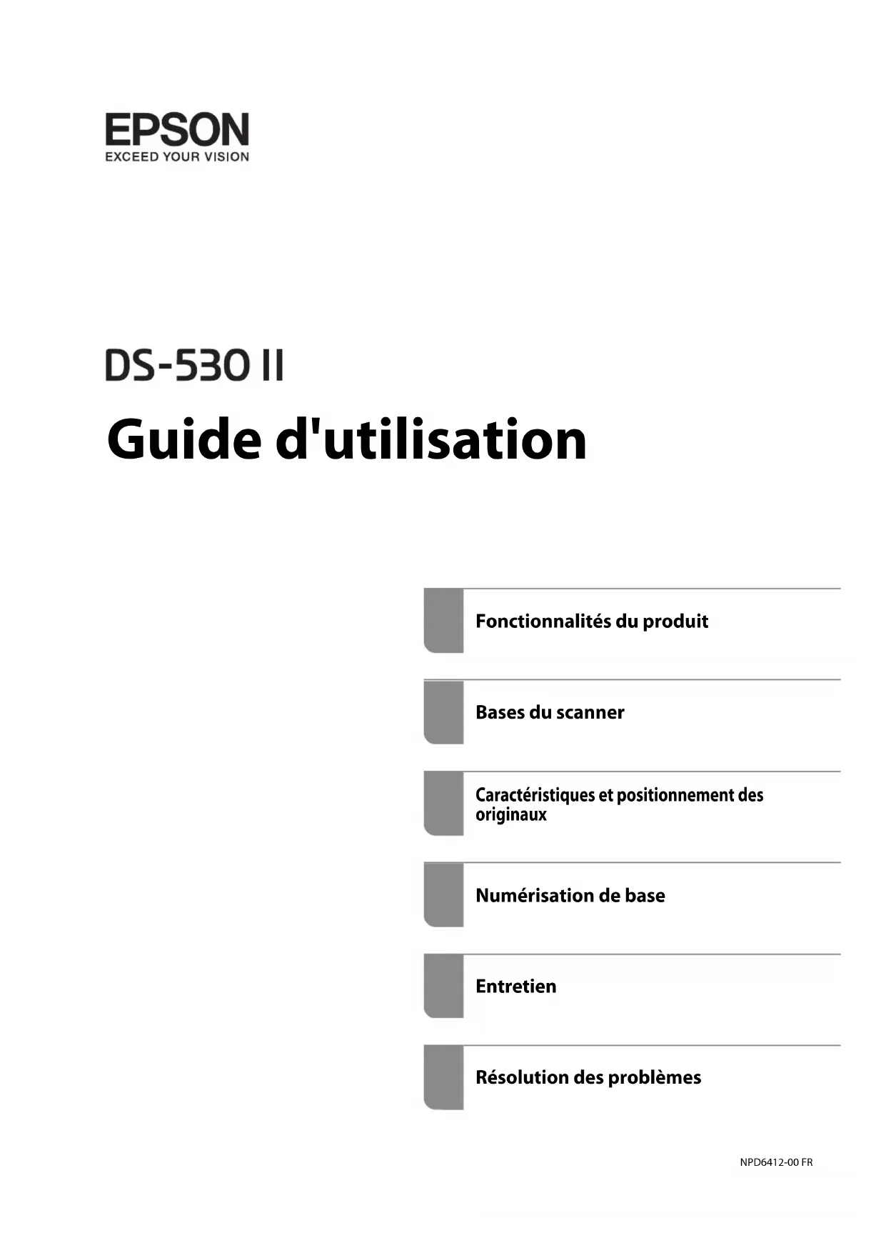 Guide d'utilisation Fonctionnalités du produit Bases du scanner Caractéristiques et positionnement des originaux Numérisation de base Entretien Résolution des problèmes NPD6412-00 FRCopyright Aucune partie de cette publication ne peut être reproduite, stockée dans un système de système de récupération de données, ni transmise, sous quelque forme que ce soit ni par aucun procédé électronique ou mécanique, y compris la photocopie, l'enregistrement ou autrement, sans le consentement écrit préalable de Seiko Epson Corporation. Aucune responsabilité ne sera engagée relative à l'utilisation des informations contenues dans ce manuel. Aucune responsabilité n'est assumée pour les dommages résultant des informations contenues dans ce manuel. L'information contenue dans la présente ne peut être utilisée qu'avec ce produit Epson. Epson décline toute responsabilité de l’utilisation de ces informations appliquées à d'autres produits. Neither Seiko Epson Corporation et ses liales ne peuvent être tenus responsables par l'acheteur de ce produit ou des tiers de tout dommage, perte, coût ou dépense encourus par l'acheteur ou des tiers à la suite d'un accident, d’une mauvaise utilisation, d’un abus ou des modications, réparations ou altérations non autorisées de ce produit, ou (sauf aux États-Unis) le non-respect strict des instructions d'exploitation et de maintenance de Seiko Epson Corporation. Seiko Epson Corporation et ses liales ne peuvent être tenus responsables des dommages ou des problèmes découlant de l'utilisation d'options ou de consommables autres que ceux désignés comme des produits Epson authentiques approuvés par Seiko Epson Corporation. Seiko Epson Corporation ne pourra être tenu pour responsable des dommages résultant des interférences électromagnétiques dues à l'utilisation de câbles d'interface autres que ceux désignés comme produits Epson approuvés par Seiko Epson Corporation. © 2020 Seiko Epson Corporation Le contenu de ce manuel et les caractéristiques de ce produit sont modiables sans préavis.Marques commerciales ❏ EPSON, EPSON EXCEED YOUR VISION, EXCEED YOUR VISION et leurs logos sont des marques ou des marques déposées de Seiko Epson.