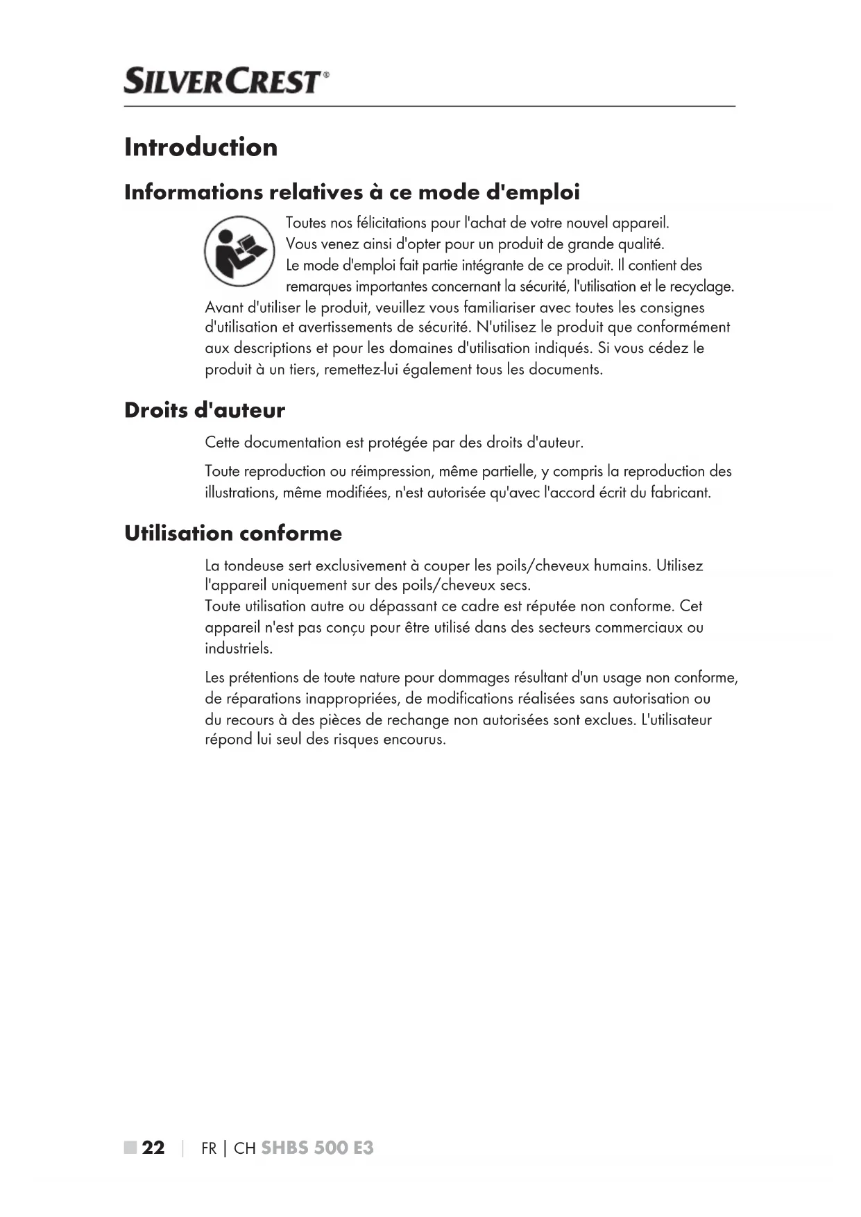 Introduction Informations relatives à ce mode d'emploi Toutes nos félicitations pour l'achat de votre nouvel appareil. Vous venez ainsi d'opter pour un produit de grande qualité. Le mode d'emploi fait partie intégrante de ce produit. Il contient des remarques importantes concernant la sécurité, l'utilisation et le recyclage. Avant d'utiliser le produit, veuillez vous familiariser avec toutes les consignes d'utilisation et avertissements de sécurité. N'utilisez le produit que conformément aux descriptions et pour les domaines d'utilisation indiqués. Si vous cédez le produit à un tiers, remettez-lui également tous les documents. Droits d'auteur Cette documentation est protégée par des droits d'auteur. Toute reproduction ou réimpression, même partielle, y compris la reproduction des illustrations, même modifiées, n'est autorisée qu'avec l'accord écrit du fabricant. Utilisation conforme La tondeuse sert exclusivement à couper les poils/cheveux humains. Utilisez l'appareil uniquement sur des poils/cheveux secs. Toute utilisation autre ou dépassant ce cadre est réputée non conforme. Cet appareil n'est pas conçu pour être utilisé dans des secteurs commerciaux ou industriels. Les prétentions de toute nature pour dommages résultant d'un usage non conforme, de réparations inappropriées, de modifications réalisées sans autorisation ou du recours à des pièces de rechange non autorisées sont exclues. L'utilisateur répond lui seul des risques encourus.FR