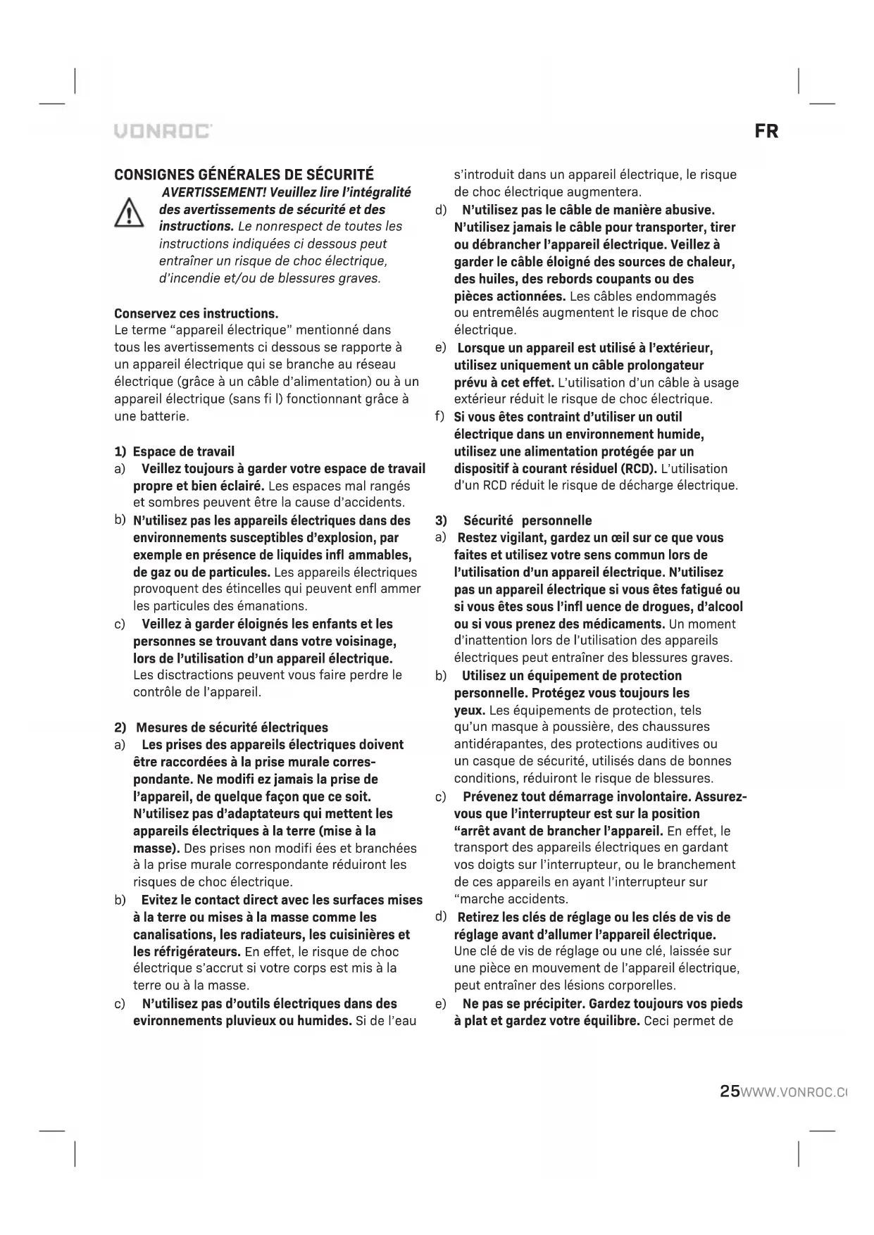 a) Ne pas ouvrir l’accu. Risque de court-circuit. b) Protéger l’accu de toute source de chaleur, com- me p. ex. l’exposition directe au soleil, au feu, à l’eau et à l’humidité. Il y a risque d’explo sion. c) En cas d’endommagement et d’utilisation non conforme de l’accu, des vapeurs peuvent s’échap- per. Ventiler le lieu de travail et, en cas de malai- ses, consulter un médecin. Les vapeurs peuvent entraîner des irritations des voies respiratoires. d) N’utilisez l’accumulateur qu’avec votre produit Vonroc. Ceci protège l’accumulateur contre une surcharge dangereuse. e) Les objets pointus comme un clou ou un tournevis et le fait d’exercer une force extérieure sur le boîtier risque d’endommager l’accu. Il peut en résulter un court-circuit interne et l’accu risque de s’enfl ammer, de dégager des fumées, d’exploser ou de surchauffer.