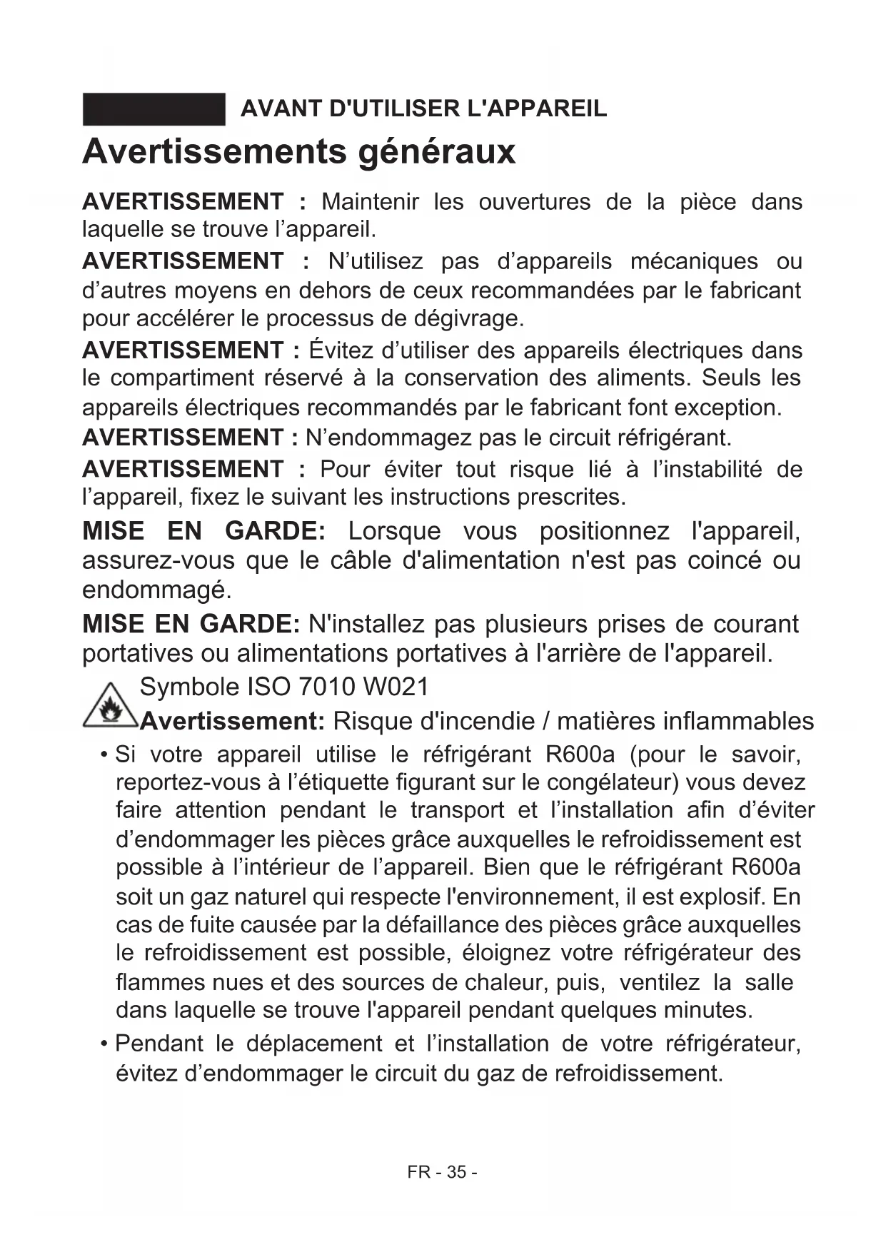 - FICHE PRODUIT - Les instructions d'utilisation s'appliquent à de nombreux modèles. Toutefois il peut y avoir des différences.FR - 35 - AVANT D'UTILISER L'APPAREIL PARTIE - 1. Avertissements généraux p. 50