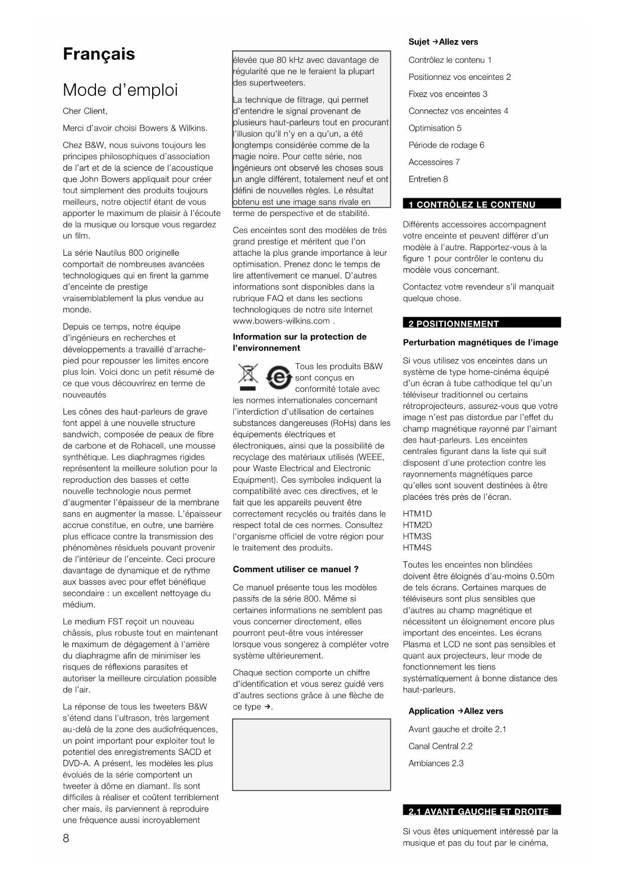 Sujet f Allez vers Contrôlez le contenu 1 Positionnez vos enceintes 2 Fixez vos enceintes 3 Connectez vos enceintes 4 Optimisation 5 Période de rodage 6 Accessoires 7 Entretien 8