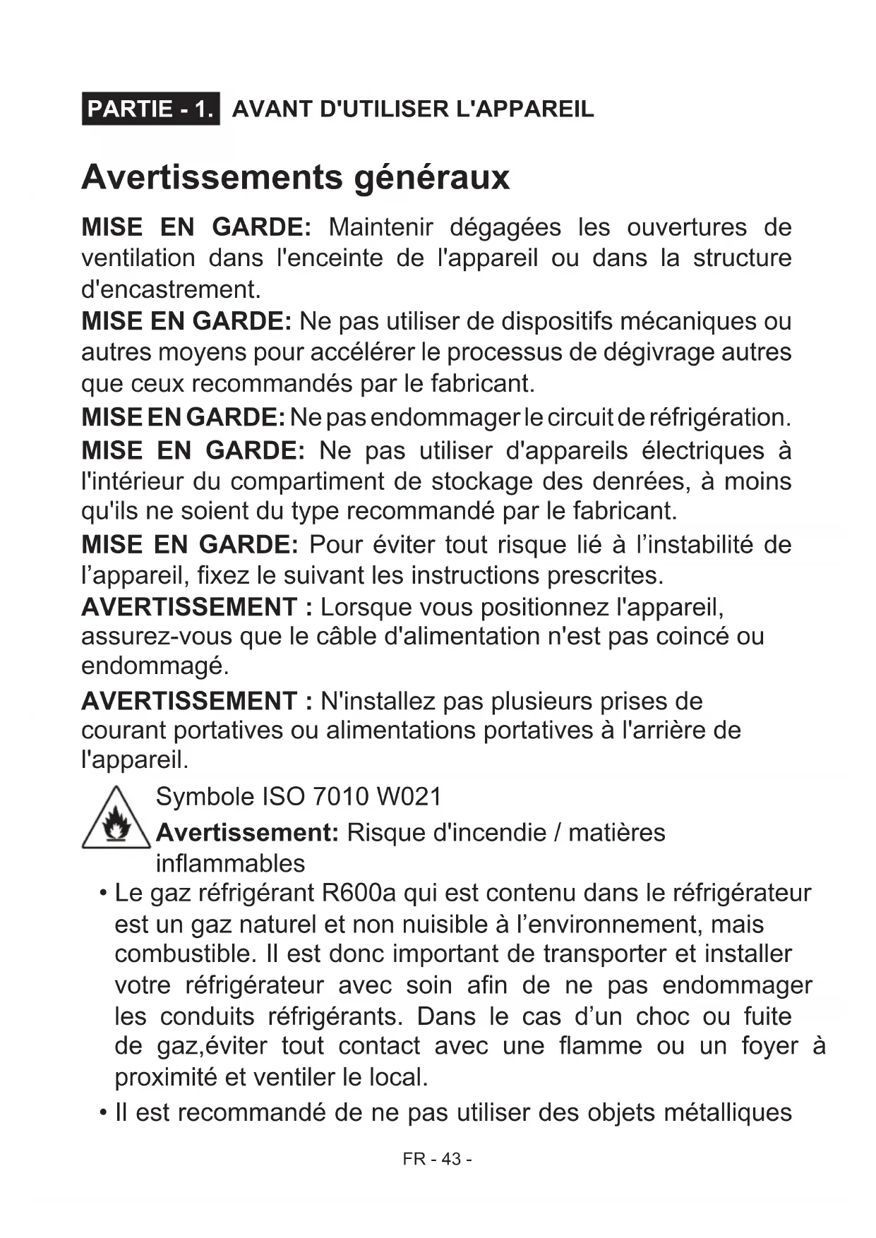 Avertissements généraux MISE EN GARDE: Maintenir dégagées les ouvertures de ventilation dans l'enceinte de l'appareil ou dans la structure d'encastrement. MISE EN GARDE: Ne pas utiliser de dispositifs mécaniques ou autres moyens pour accélérer le processus de dégivrage autres que ceux recommandés par le fabricant. MISE EN GARDE: Ne pas endommager le circuit de réfrigération. MISE EN GARDE: Ne pas utiliser d'appareils électriques à l'intérieur du compartiment de stockage des denrées, à moins qu'ils ne soient du type recommandé par le fabricant. MISE EN GARDE: Pour éviter tout risque lié à l’instabilité de l’appareil, xez le suivant les instructions prescrites.