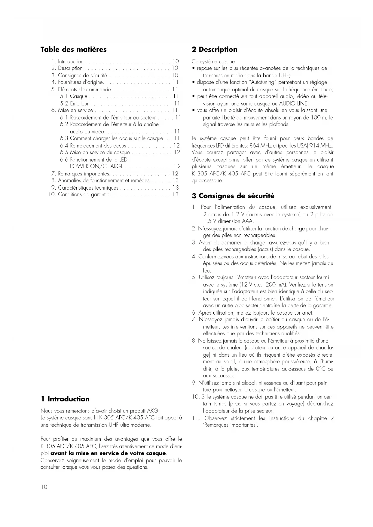 1 Introduction Nous vous remercions d’avoir choisi un produit AKG. Le système casque sans fil K 305 AFC/K 405 AFC fait appel à une technique de transmission UHF ultra-moderne. Pour profiter au maximum des avantages que vous offre le K 305 AFC/K 405 AFC, lisez très attentivement ce mode d’em- ploi avant la mise en service de votre casque. Conservez soigneusement le mode d’emploi pour pouvoir le consulter lorsque vous vous posez des questions. 2 Description Ce système casque