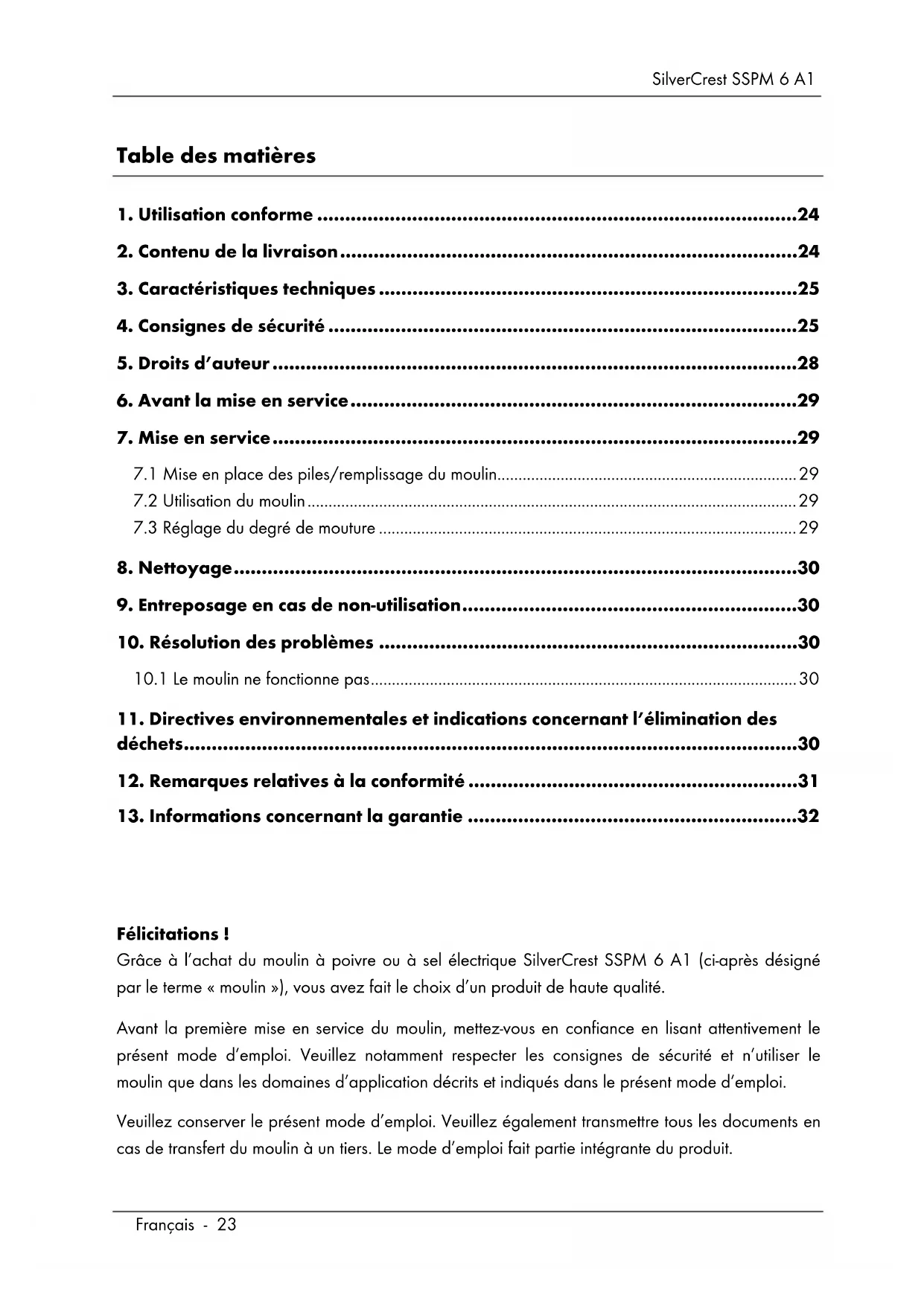 Félicitations ! Grâce à l’achat du moulin à poivre ou à sel électrique SilverCrest SSPM 6 A1 (ci-après désigné par le terme « moulin »), vous avez fait le choix d’un produit de haute qualité. Avant la première mise en service du moulin, mettez-vous en confiance en lisant attentivement le présent mode d’emploi. Veuillez notamment respecter les consignes de sécurité et n’utiliser le moulin que dans les domaines d’application décrits et indiqués dans le présent mode d’emploi. Veuillez conserver le présent mode d’emploi. Veuillez également transmettre tous les documents en cas de transfert du moulin à un tiers. Le mode d’emploi fait partie intégrante du produit.SilverCrest SSPM 6 A1
