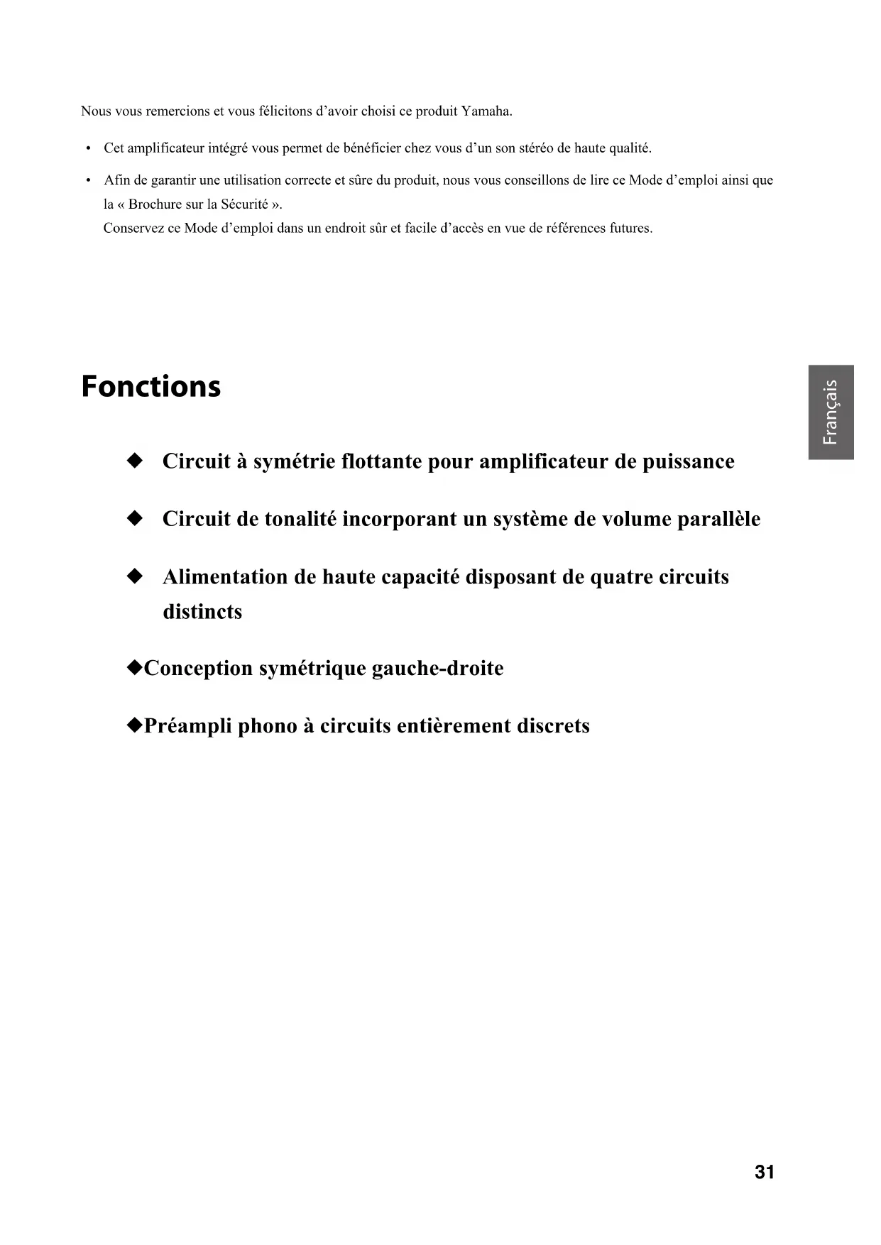 - Il se pourrait que l’emballage contienne plusieurs cordons d’alimentation selon le pays de vente. Utilisez le cordon d’alimentation approprié pour les prises de courant dans votre région. Sommaire Fonctions. . . . . . . . . . . . . . . . . . . . . . . . . . . . . . . 31 À savoir avant d’utiliser ce produit . . . . . . . 32 À propos de ce manuel. . . . . . . . . . . . . . . . . . . . . 32Accessoires fournis . . . . . . . . . . . . . . . . . . . . . . . . 32 Commandes et fonctions . . . . . . . . . . . . . . . . 33 Panneau avant . . . . . . . . . . . . . . . . . . . . . . . . . . . . 34Panneau arrière . . . . . . . . . . . . . . . . . . . . . . . . . . . 38Télécommande. . . . . . . . . . . . . . . . . . . . . . . . . . . . 40Mise en place des piles dans la télécommande . . . . . . . . . . . . . . . . . . . . . . . . . . . 42Utilisation de la télécommande . . . . . . . . . . . 42 Connexions. . . . . . . . . . . . . . . . . . . . . . . . . . . . . 43 Schéma des connexions. . . . . . . . . . . . . . . . . . . . 44Connexion des enceintes . . . . . . . . . . . . . . . . . . 46Connexion via des câbles d’enceinte . . . . . . 46Connexion via des câbles avec fiches bananes. . . . . . . . . . . . . . . . . . . . . . . . . . . . . . . . . . 47Connexion via des câbles à cosse en Y. . . . . 47Connexion bifilaire . . . . . . . . . . . . . . . . . . . . . . . . .47Connexion Trigger . . . . . . . . . . . . . . . . . . . . . . . . .48Connexion à distance. . . . . . . . . . . . . . . . . . . . . . .48Commande de cet appareil depuis une autre pièce . . . . . . . . . . . . . . . . . . . . . . . . . . .48Connexion à distance entre les composants Yamaha . . . . . . . . . . . . . . . . . . . . . .49Raccordement du cordon d’alimentation . . . .49 Annexe . . . . . . . . . . . . . . . . . . . . . . . . . . . . . . . . .51 Caractéristiques techniques. . . . . . . . . . . . . . . . .52Schéma fonctionnel . . . . . . . . . . . . . . . . . . . . . . . .54Caractéristiques acoustiques. . . . . . . . . . . . . . . .55Caractéristiques de contrôle du timbre. . . . .55Distorsion harmonique totale . . . . . . . . . . . . .55Distorsion harmonique totale (PHONO) . . . .56Guide de dépannage . . . . . . . . . . . . . . . . . . . . . . .57Entretien. . . . . . . . . . . . . . . . . . . . . . . . . . . . . . . . . . .58 NoteFrançais