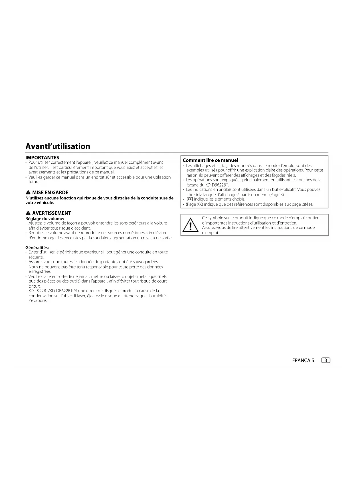 - KD-T922BT/KD-DB622BT: Si une erreur de disque se produit à cause de la condensation sur l’objectif laser, éjectez le disque et attendez que l’humidité s’évapore. Comment lire ce manuel