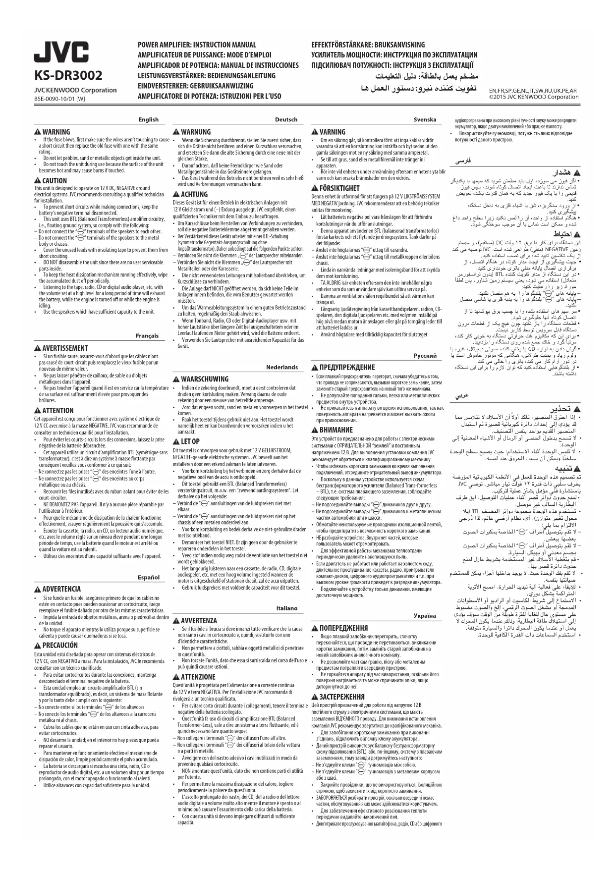 - Ne pas toucher l’appareil quand il est en service car la température de sa surface est suffisamment élevée pour provoquer des brûlures. ATTENTION Cet appareil est conçu pour fonctionner avec système électrique de 12 V CC avec mise à la masse NÉGATIVE. JVC vous recommande de consulter un technicien qualifié pour l’installation.