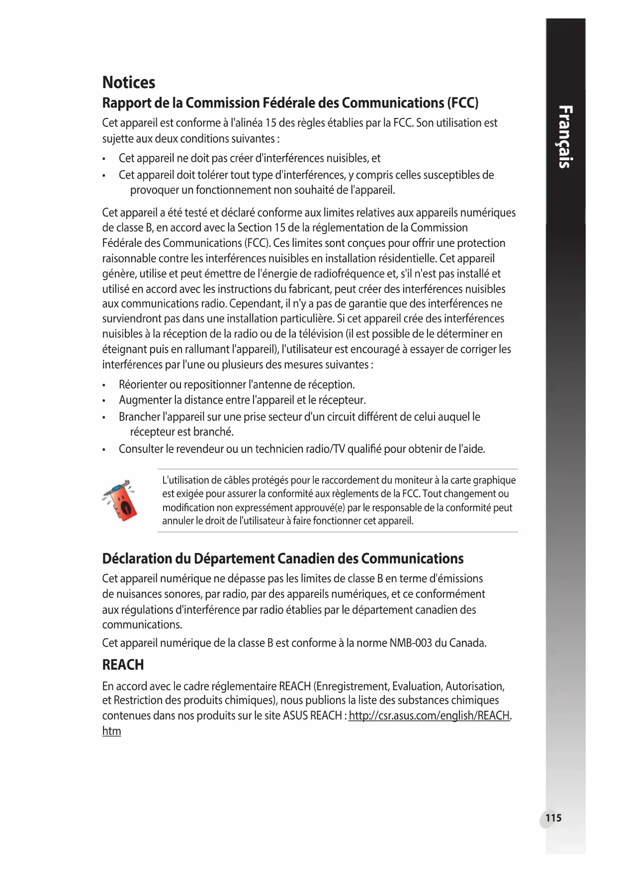 - Consulterlerevendeurouuntechnicienradio/TVqualiépourobtenirdel'aide. Déclaration du Département Canadien des Communications Cet appareil numérique ne dépasse pas les limites de classe B en terme d'émissions de nuisances sonores, par radio, par des appareils numériques, et ce conformément auxrégulationsd'interférenceparradioétabliesparledépartementcanadiendes communications. Cet appareil numérique de la classe B est conforme à la norme NMB-003 du Canada. L'utilisation de câbles protégés pour le raccordement du moniteur à la carte graphique estexigéepourassurerlaconformitéauxrèglementsdelaFCC.Toutchangementou modicationnonexpressémentapprouvé(e)parleresponsabledelaconformitépeut annuler le droit de l'utilisateur à faire fonctionner cet appareil. REACH En accord avec le cadre réglementaire REACH (Enregistrement, Evaluation, Autorisation, et Restriction des produits chimiques), nous publions la liste des substances chimiques contenues dans nos produits sur le site ASUS REACH : http://csr.asus.com/english/REACH. htmFrançais